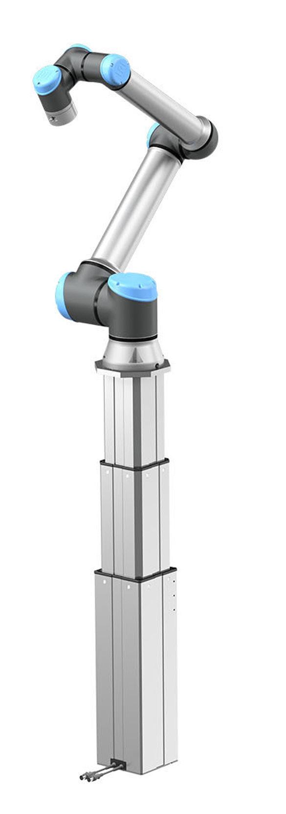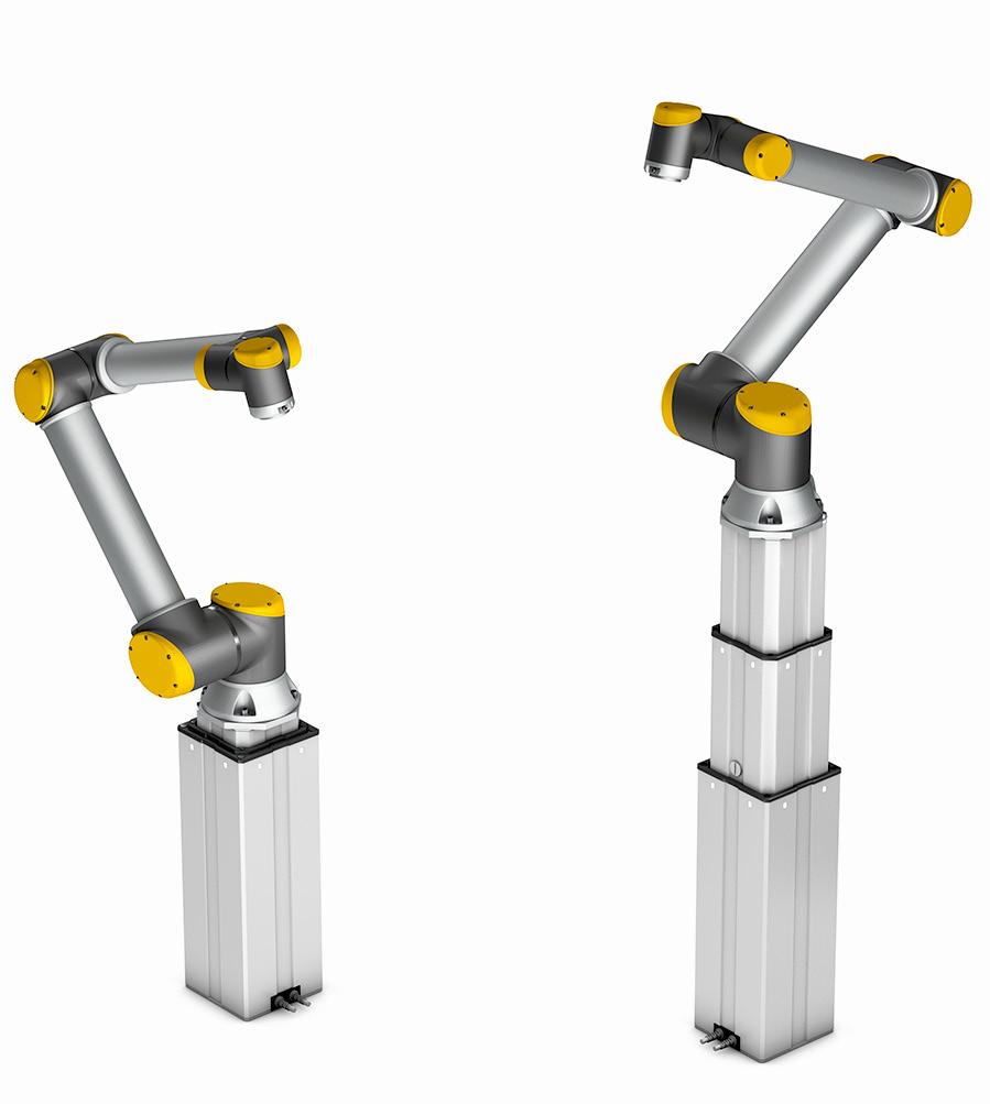 Las columnas verticales de diseño telescópico se pueden montar en el suelo o en el techo, de modo que un cobot pueda operar