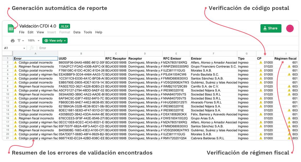· La herramienta efectúa el análisis de los CFDIs 4.0 que recibiste y detecta si tienen los datos correctos: el código postal y el régimen fiscal.