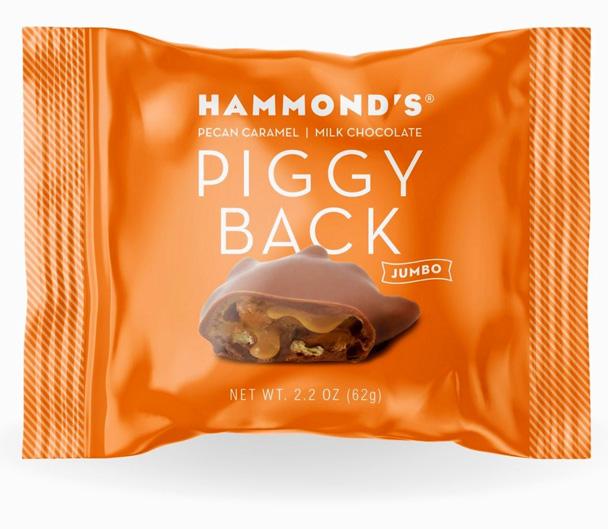 * Piggy Backs de chocolate con leche, nueces y caramelo.también conocidas como tortugas, estas deliciosas golosinas son la combinación perfecta de deliciosas nueces pecanas, chicloso caramelo sabor vainilla y suave chocolate con leche. Cada mordida es una apetecible combinación de dulce y crujiente sabor que te dejará con ganas de más. Empaquetados individualmente, son perfectos como un snack "para el camino" o como regalo para el ser amado. Ya seas fan de las nueces pecanas, el caramelo o el chocolate, Milk Chocolate Pecan Piggy Backs deleitarán tu paladar.