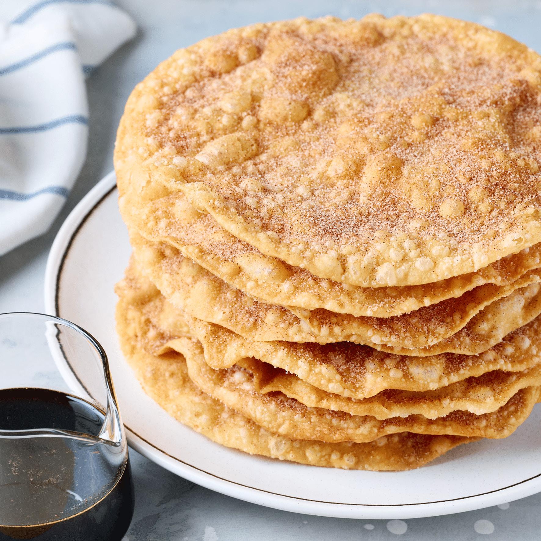 de harina, huevo, agua, sal y manteca de cerdo que se deja reposar, se estira y se moldea. Después se fríe y se espolvorea con azúcar o se baña con miel de abeja o piloncillo.