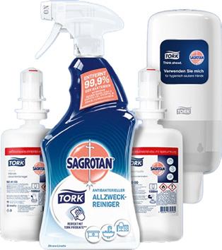 Tork und Reckitt Benckiser bringen zusammen ein Sortiment an Hygiene-Produkten auf den Markt. Dieses umfasst folgendes: „Tork Sagrotan Antibakterieller Allzweck-Reiniger“ in einer vollständig recycelbaren Flasche mit Sprühkopf, eine antimikrobielle „Tork Sagrotan Schaumseife“ sowie „Tork Sagrotan Händedesinfektionsgel“ für die Verwendung in „Tork“-Spendern. www.tork.at