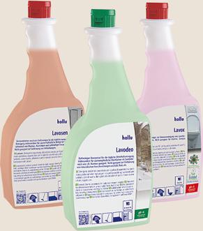 Mit „Lavosen“ launcht hollu einen schonenden wie effektiven Sanitärreiniger, der Neuverschmutzungen vorbeugt und einen angenehmen Frischeduft hinterlässt. Er entfernt leichte Kalkablagerungen auf allen säurebeständigen Oberflächen und schont das (Kunststoff)Material. Dank seiner hydrophilen Wirkung erleichtert „Lavosen“ die Folgereinigung („Easy-to-CleanEffekt“). www.hollu.com