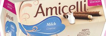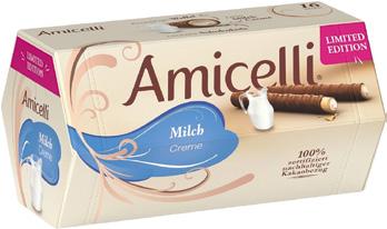 Zu gefüllten und von Schokolade ummantelten Waffelröllchen hab ich ein besonderes Verhältnis. Wenn ich als kleines Mädchen bei meiner Tante im Waldviertel zu Besuch war, war ihr erster Weg in die Speis und dort war immer, immer, immer eine Packung „Fanfare“ für mich vorrätig. Den „Amicelli“ als doch recht, sagen wir mal, ähnliches Konstrukt, war ich wenig überraschend von Beginn weg ebenfalls freundschaftlich verbunden. Und das, obwohl ich doch – wenn Sie meine Lieblingsprodukt-Texte regelmäßig lesen, wissen Sie es – gar nicht so die nussige, sondern eher die helle, milchige Nascherin bin. Tja, kürzlich stand dann plötzlich eine Packung „Amicelli Milch Creme“ auf meinem Schreibtisch – gewohntes Rezept aus Waffel mit Schokohülle, aber diesmal mit weißer Milchcreme innen drin. Was soll ich sagen – diese „Amicelli“-Limited Edition und ich sind jetzt Besties. Die Freundschaft könnte höchstens noch bei einer weiteren Variante mit weißer Schokohülle in Gefahr geraten…