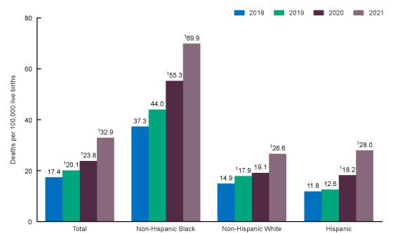 1Statistically significant increase from previous year (p < 0.05). NOTE: race groups are a single race. SOURCE: National Center for Health Statistics, National Vital Statistics System, Mortality.and social inequities in maternal and infant health outcomes (Tyre et al., 2022).