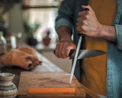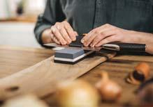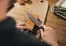 A Roll-Sharp™ élező segítségével a kések gyorsan és egyszerűen élezhetők: az élezőt egyenletes felületen elhelyezve a kés pengéjét 15-20 alkalommal told előre és húzd vissza. Az eszköz kialakításának köszönhetően az élezés automatikusan a megfelelő szögben történik. Fontos, hogy a kést előre és hátra is mozgasd, mert csak így lehet mindkét oldalát egyformán megélezni! Függetlenül attól, hogy melyik módszer mellett döntesz, az élezést követően a késeket forró vízzel le kell öblíteni, majd gondosan meg kell őket szárítani.
