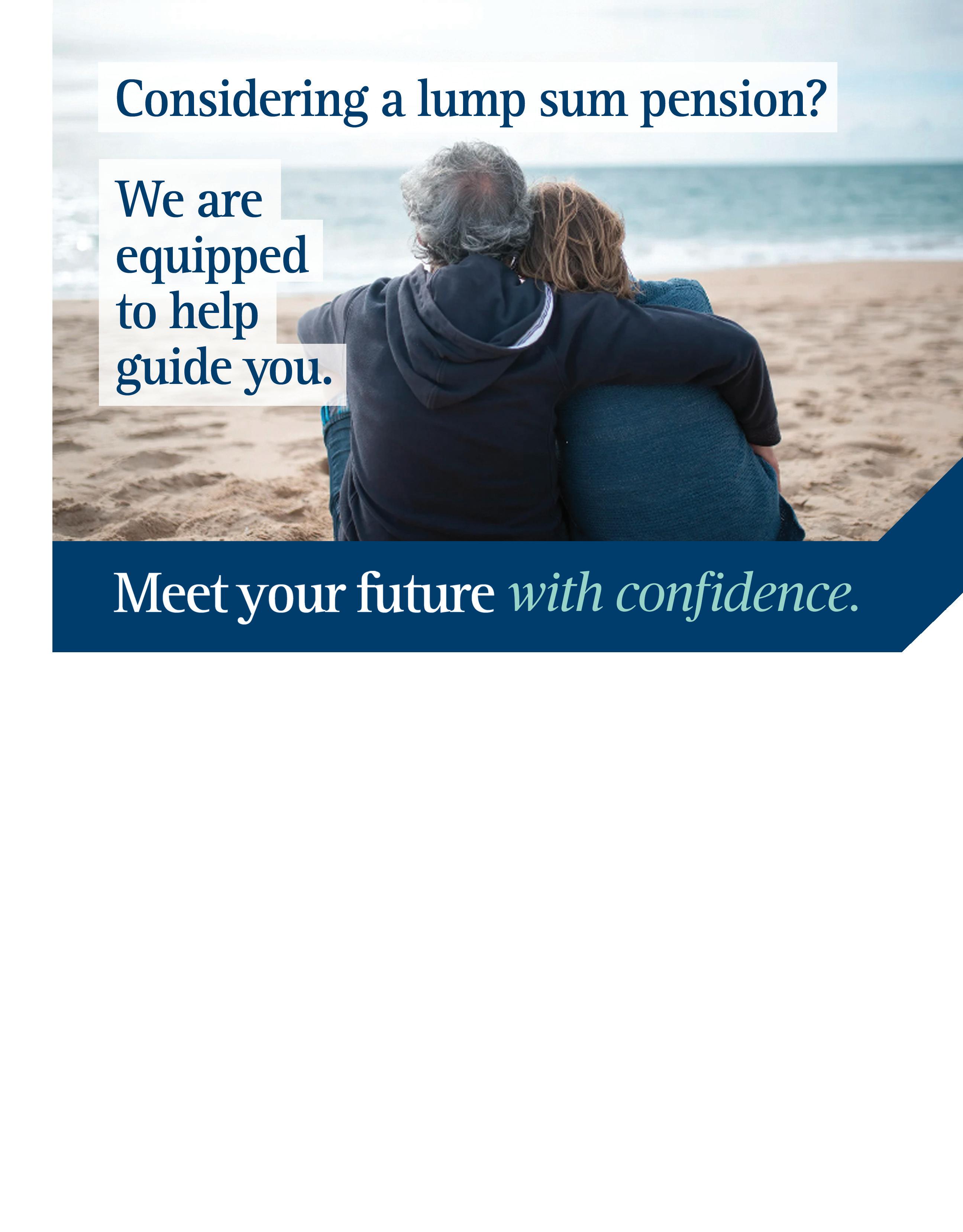 The decision to take a lump sum or monthly pension is an important decision and is dependent on the following individual situations: • Social security claiming analysis • Lifestyle expenses • Investment assets • Interest rates and more Call us today to schedule your complimentary initial consultation: 877-2- RETIRE Cousino, Moyer Retirement Group, a financial advisory practice of Ameriprise Financial Services, LLC 734.285.1854 19727 Allen Rd., Suite 21, Brownstown, MI 48183 The initial consultation provides an overview of financial planning concepts. You will not receive written analysis and/or recommendations. Ameriprise Financial cannot guarantee future financial results. Ameriprise Financial Services, LLC. Member FINRA and SIPC. © 2023 Ameriprise Financial, Inc. All rights reserved. Not FDIC or NCUA Insured | No Financial Institution Guarantee | May Lose Value