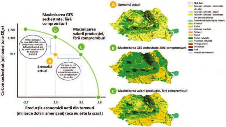 La punctul C, produc]ia economic\ este maximizat\ f\r\ a reduce sechestrarea carbonului. Adic\ România sechestreaz\ în continuare 911 milioane tone CO 2, dar cre[te valoarea produc]iei din culturi, p\[unat [i silvicultur\ cu 1,3 miliarde dolari pe an în compara]ie cu scenariul actual.