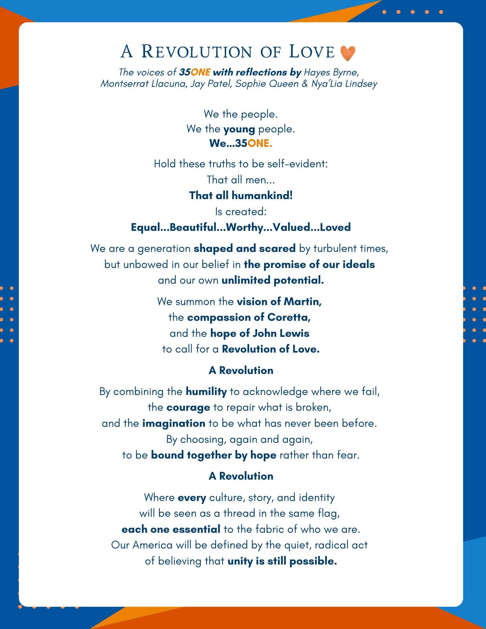 As you begin your Spring Service journey, know that our 35ONE family is united in celebration of you! Thank you for building a more loving, united, and compassionate community, Commonwealth, and world. Let’s keep this Revolution of Love rolling!