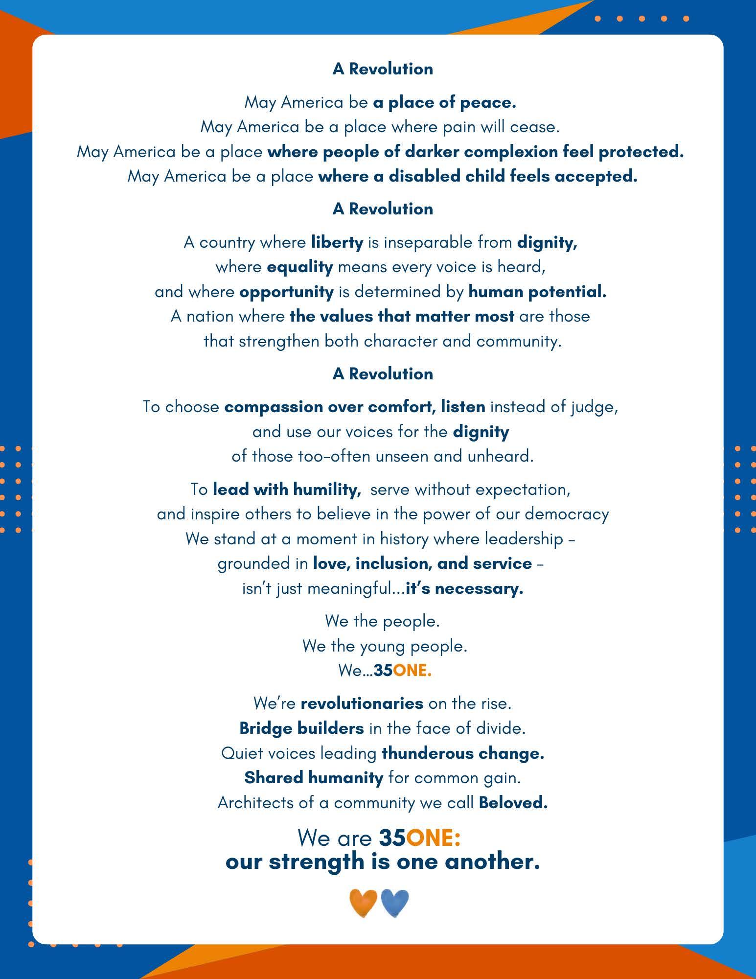 I believe in the power of audacious hope, the transformative impact of kindness, and the unlimited potential of 35ONE the belief and practice that we are stronger together.