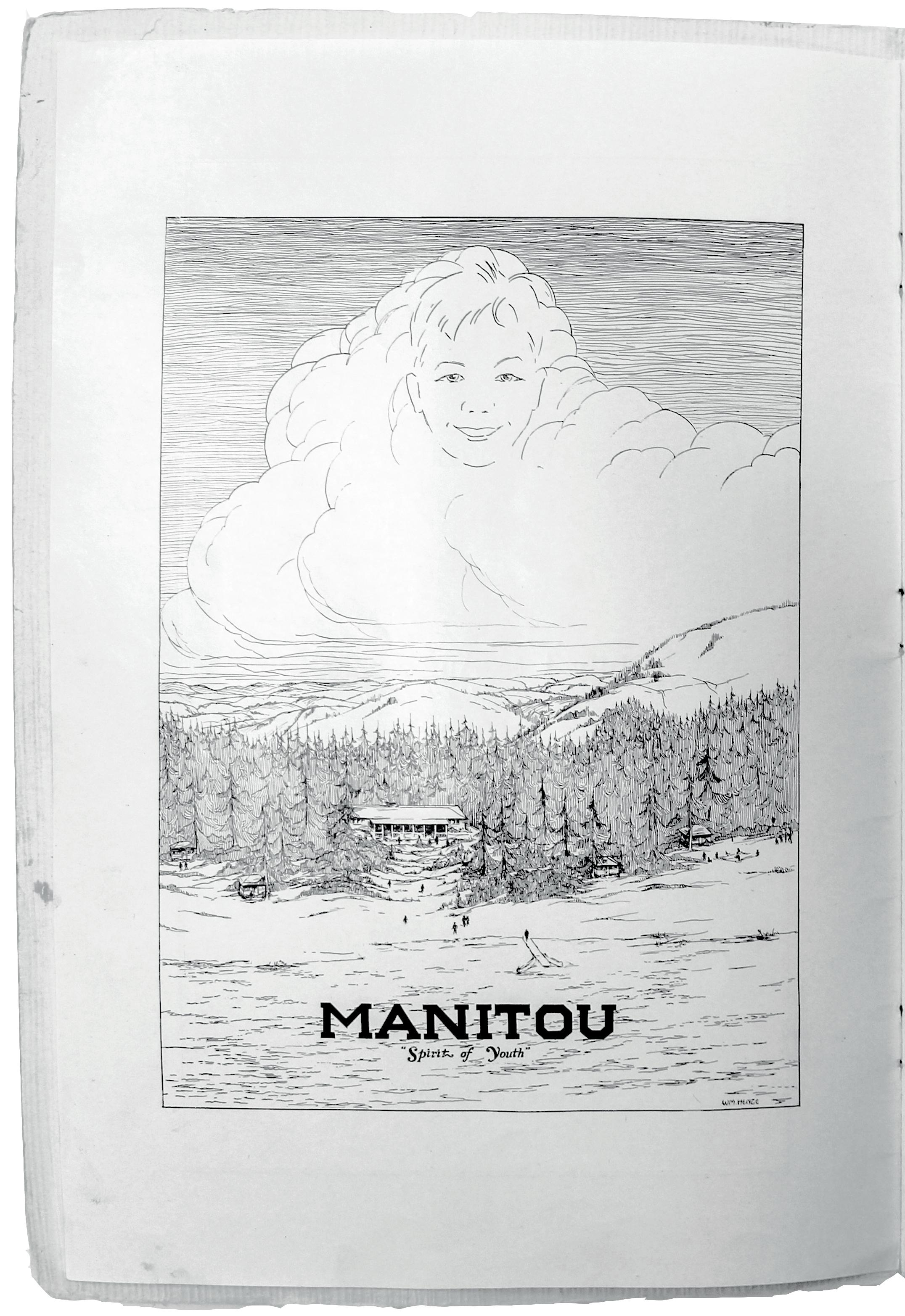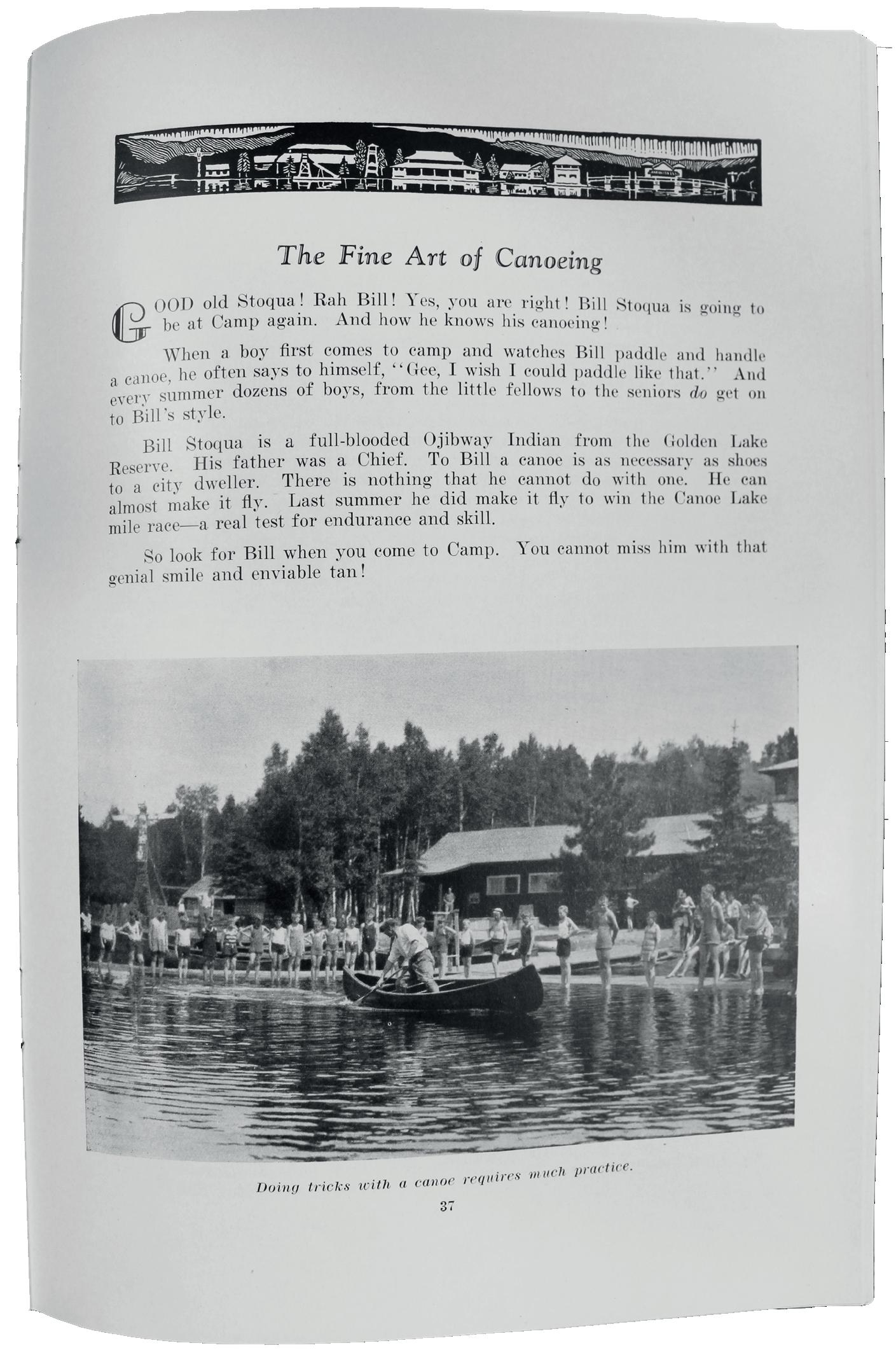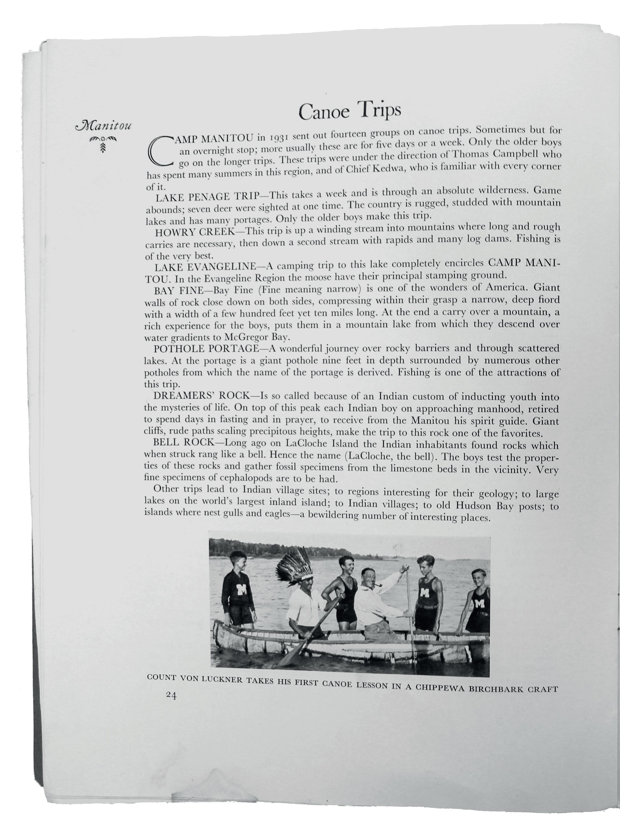 Camp for Boys Camp Manitou "On America's Last Frontier" p. 1, "No frontier is authentic without the Indian. In this respect Camp Manitou does not fail. All about are reserves on which are found the Indian …" p. 14 seems to have native councellors teaching woodcraft and canoeing. 2018- 041/001