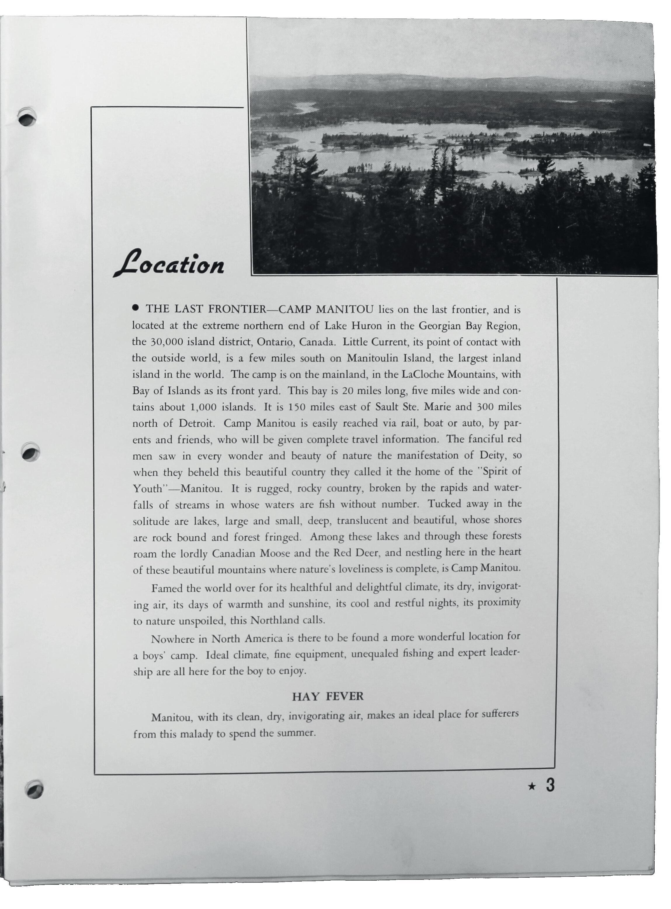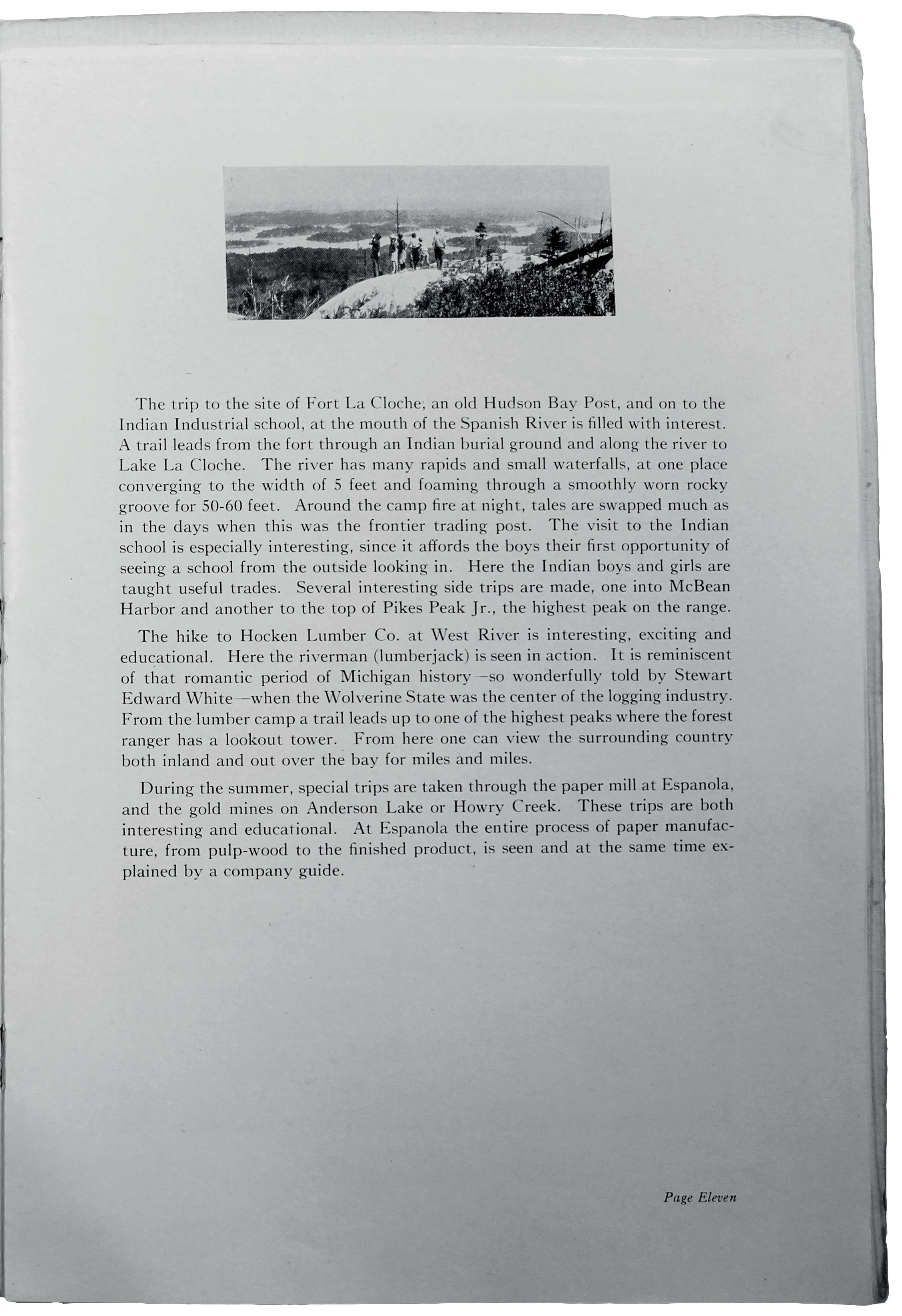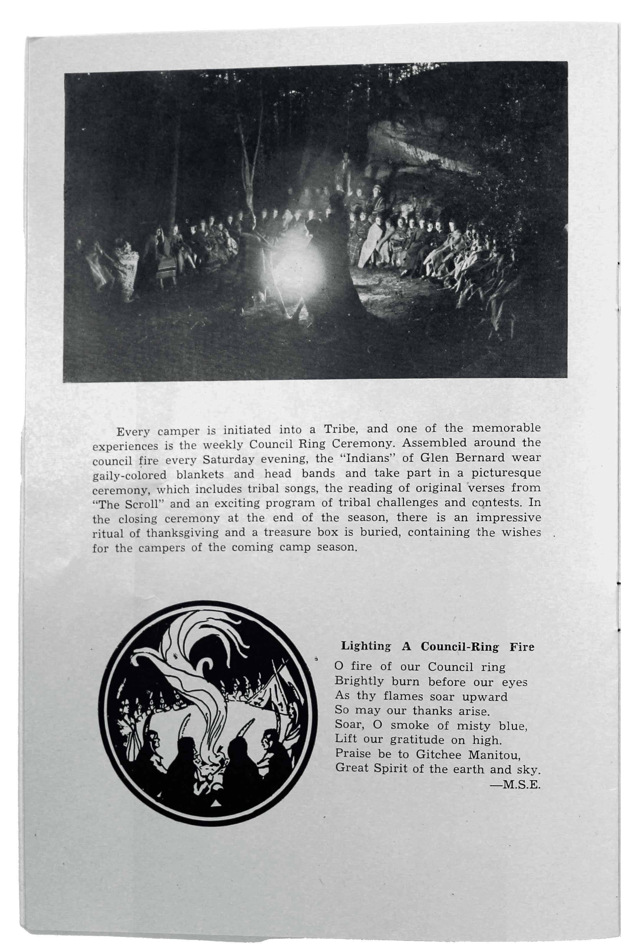 Camp for Boys Camp Manitou "On America's Last Frontier" p. 1, "No frontier is authentic without the Indian. In this respect Camp Manitou does not fail. All about are reserves on which are found the Indian …" p. 14 seems to have native councellors teaching woodcraft and canoeing. 2018- 041/001