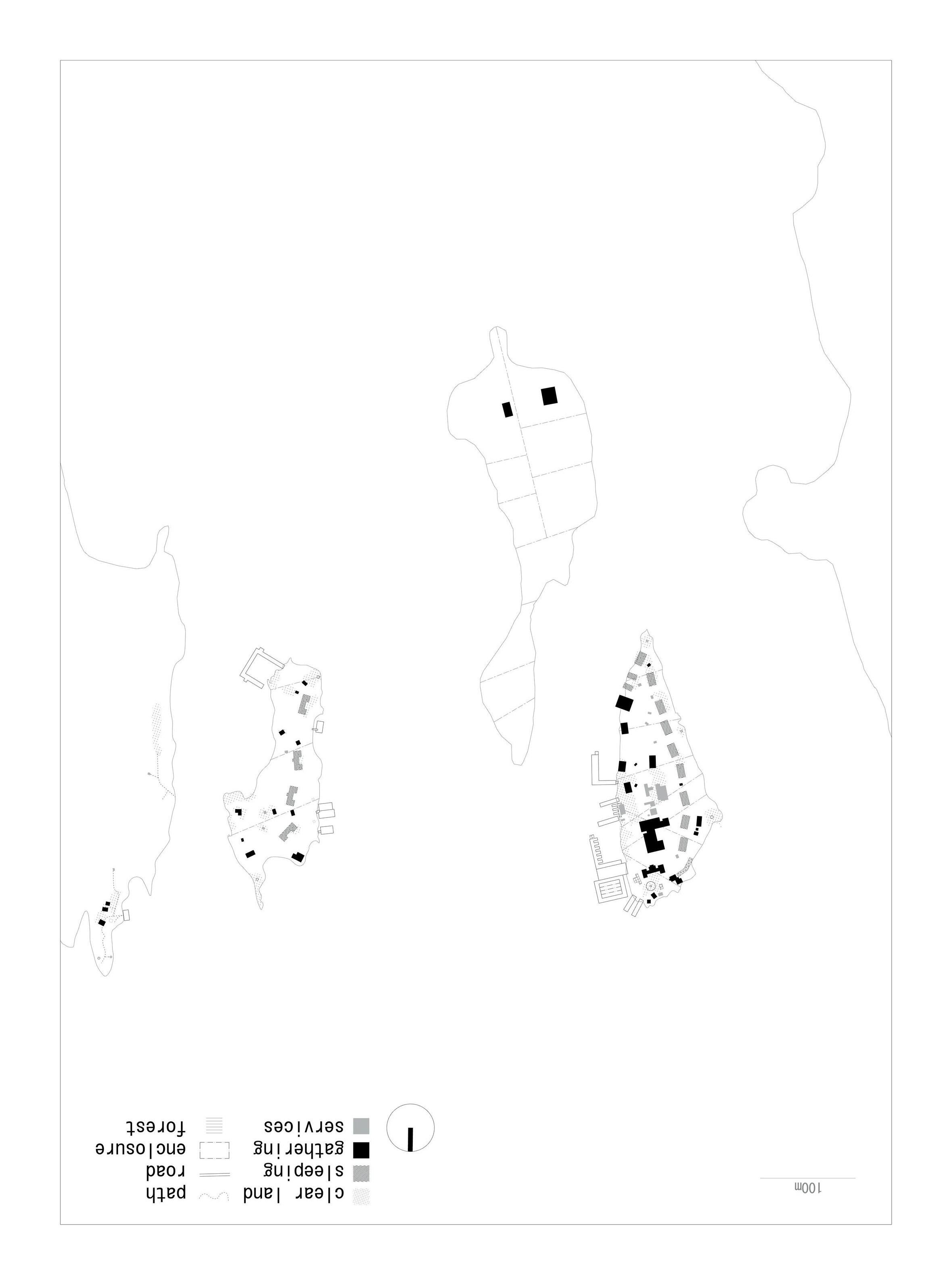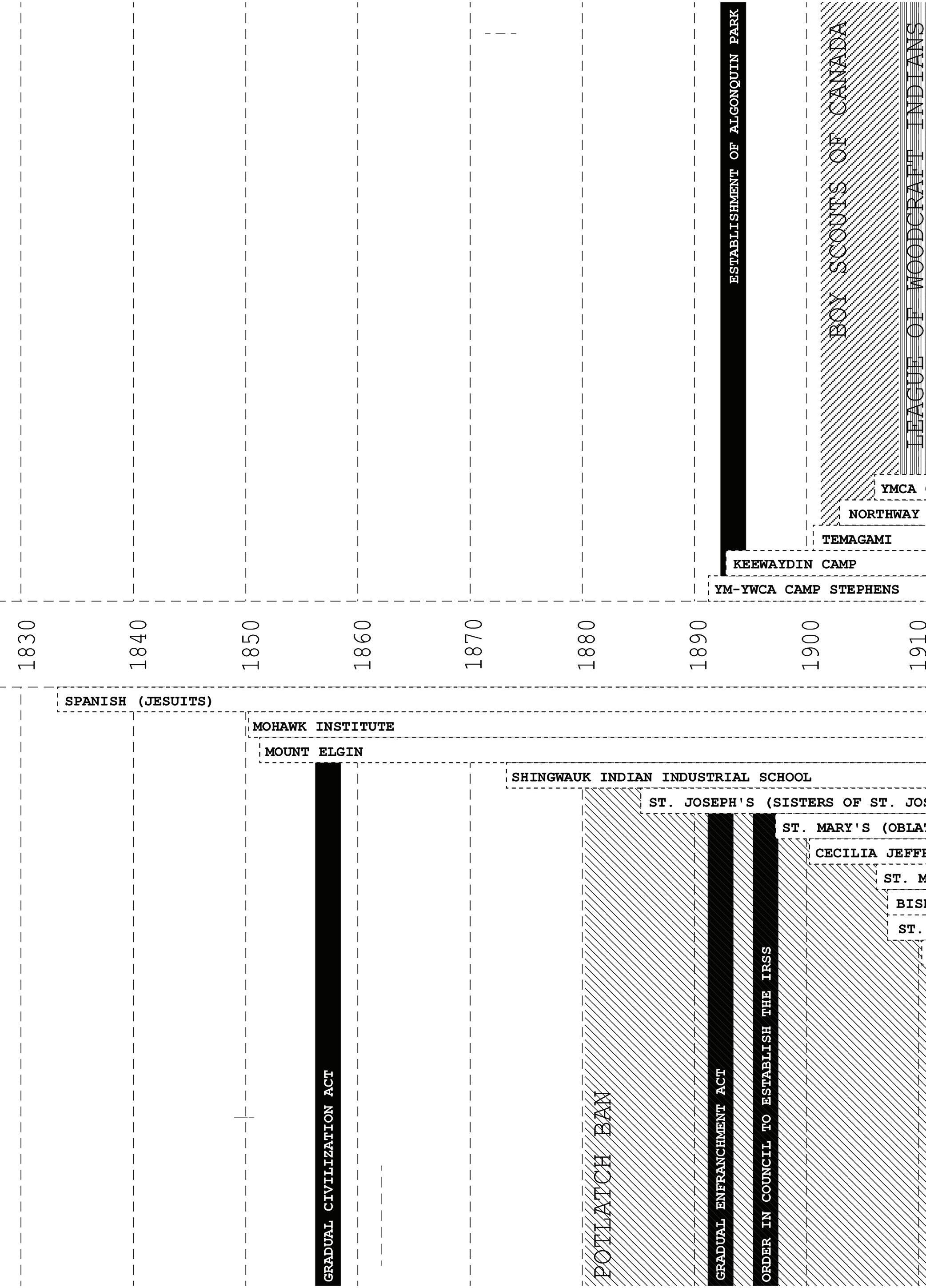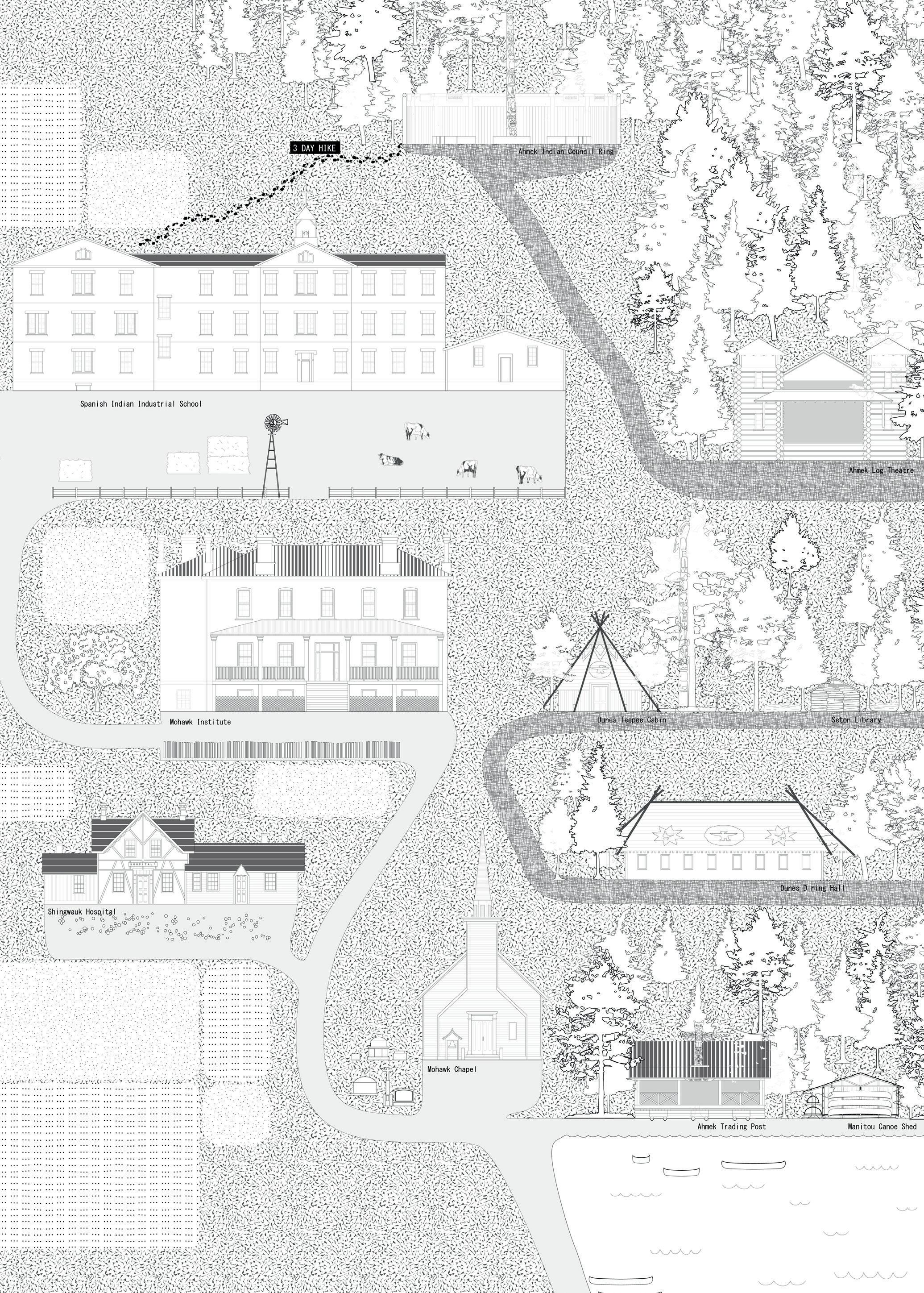 Through the analysis of two distinct typologies of the youth camp: the Indian Residential School for Indigenous children and the Woodcraft Summer Camp for Settler children—the thesis aims to understand the instrumentality of the camp as it has been utilised to forward the settler colonial agenda in Canada. The research attempts to redefine and connect the diagrams that each camp represent as related projects of indoctrination and as spatial conditions of the camp. By tracing politically charged flows of cultural capital (or the barbaric transmission of culture19) that make up much of the curriculums at each institution, I trace a pattern of cultural appropriation (simply, theft) that is established by Settlers justified by destructive ideologies. Through paralleling the operations of Indigenous dispossession and Settler possession as the architectures of these institutions are set up to perform, the thesis reflects on the agency of spatial design in affecting how belonging within a nation, as well as landscape is negotiated and controlled. The thesis argues across what are mostly separate bodies of research and material traces to argue on the tensions between their co-existence. I argue that the colonial tendencies of these programs can be defined in terms of their relationality as an assemblage, as they evolved over the twentieth century. The camps are read as a layer of the constructed territory of Canada.