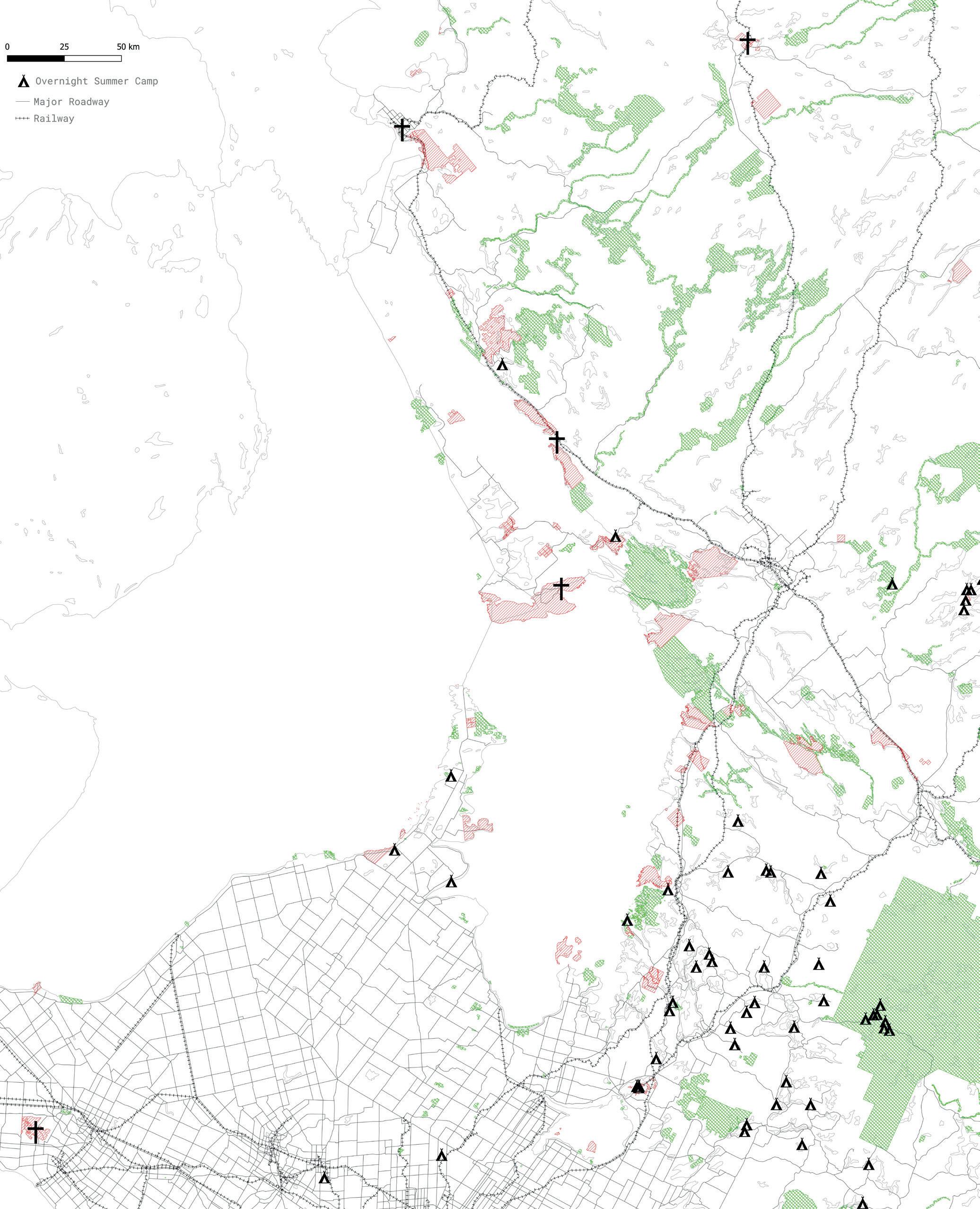 To emphasise my point about the contested issues at stake, I’m going to reiterate: the land that the case studies of the thesis are situated are the unceded territory of the Anishinaabek peoples, who still occupy this land. The work was written mainly from the AA School, in London, England—a place I am privileged to study at on a visa as a Canadian citizen. This distance from my home in Canada, working in the UK and immersed in a school setting is itself not unlike a form of camp environment. The community at the AA and especially my classmates in Projective Cities formed my camp family over the last 18 months.