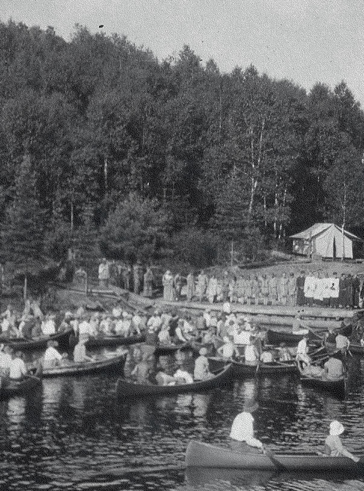 Three Summer Camps were chosen as case studies based on the availability of archival material and relevant scholarship. Camp Ahmek for Boys (1921 - present), in Algonquin Park, and Camp Glen Bernard for Girls (1922 - present), near Sundridge ON, are among the most well-known and researched summer camps in Ontario.20 The third summer camp case study is Camp Manitou (1925 - present), near Whitefish Falls, Ontario, chosen based on the availability of materials, and the camp’s proximity to Spanish Indian Residential School. In their early years, Ahmek and Glen Bernard were non-denominational religious camps, and slowly transitioned to fully secular programming. Camp Manitou is a Christian camp. The programming at all three also included an “Indian Program”.