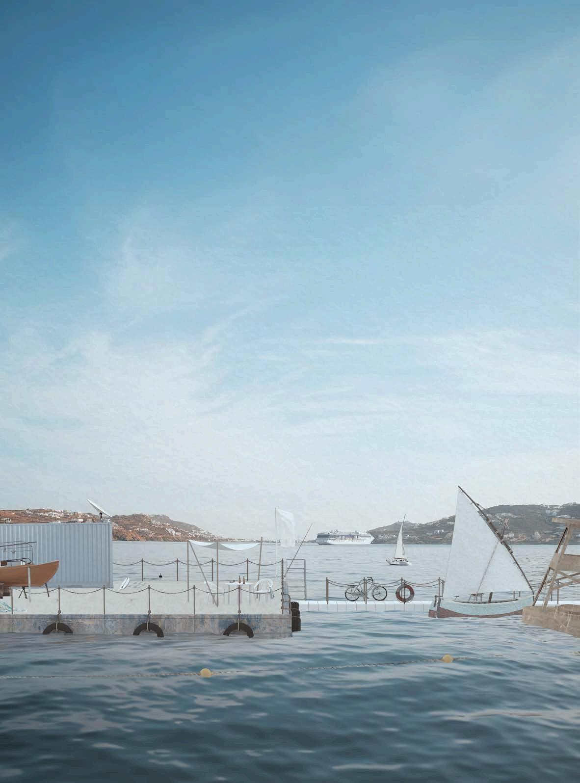 Chapter 1, Mobilities historically analyses the organisation of the sea and the use of architecture as necessary pre-conditions for the Archipelago's territorial remaking. The shift from a de-centralised colonial trade network to an institutionally managed surface under the nation-state is traced through the examination of sea borders and coastline architectures in the Cyclades. Ultimately leading to the sea’s mono-functionalisation and canalisation from multiple touristic migration flows that carry their own representations and practices, the Archipelago has been hierarchised as a constellation of destinations. Arguing against the conception of mobility as a homogeneous field, the research looks at crossings and their characteristics as the differentiating elements between mobile bodies. As such, the territorial conditions of tourism are readable through the management of the edge This renders immobility the Archipelago’s primary field of friction where power structures are manifested in the effects of seasonality and external dependence. In response, the first design exercise depicts a scenario of a soft mobility infrastructure that occupies the sea in order to enceite it as habitable. Attempting a disruptive gesture, a series of floating grounds imagine a condition where the port is soft and de-militarised, the route is walkable, and the border is visible, triggering negotiations around the use of the sea.