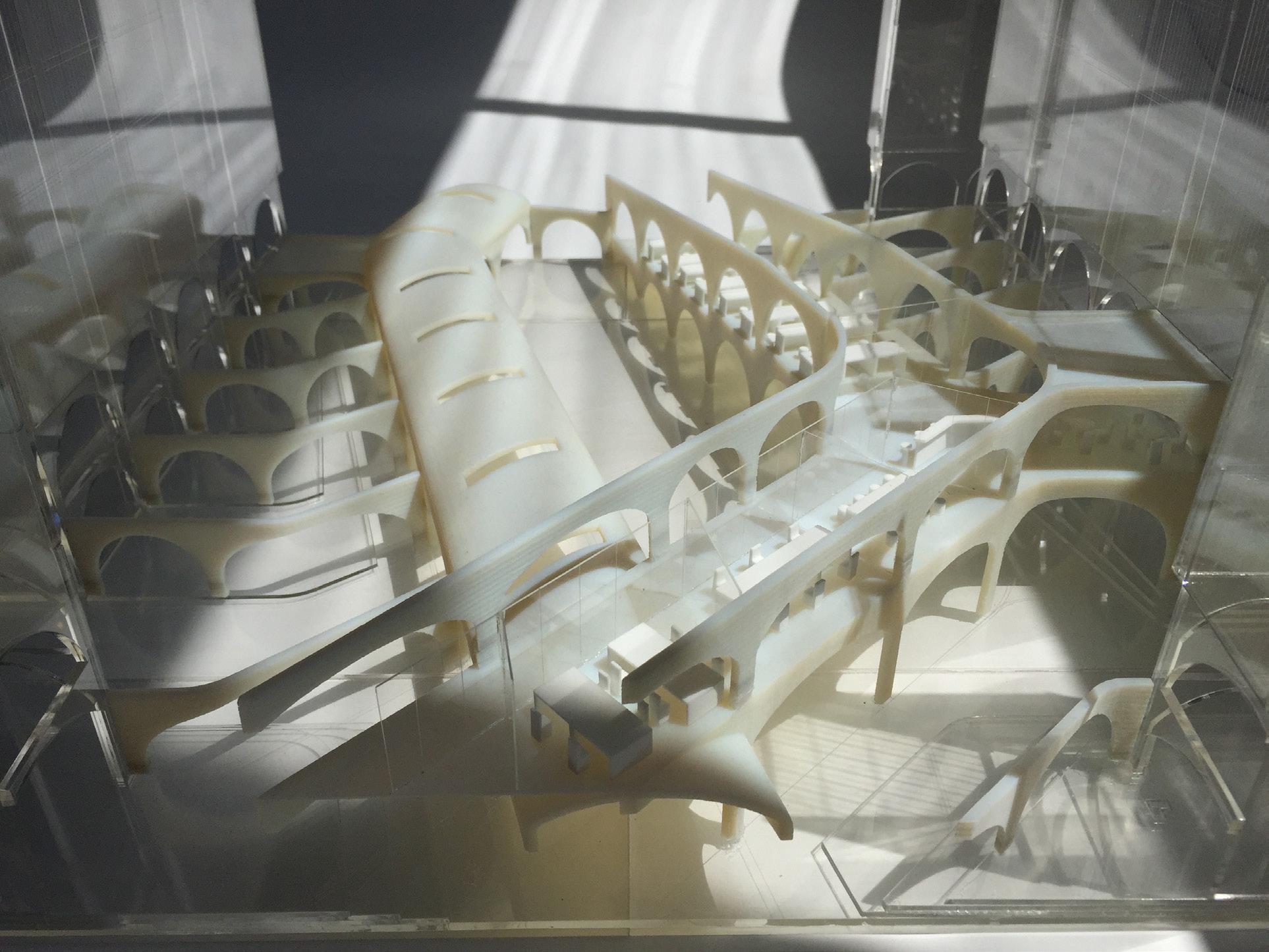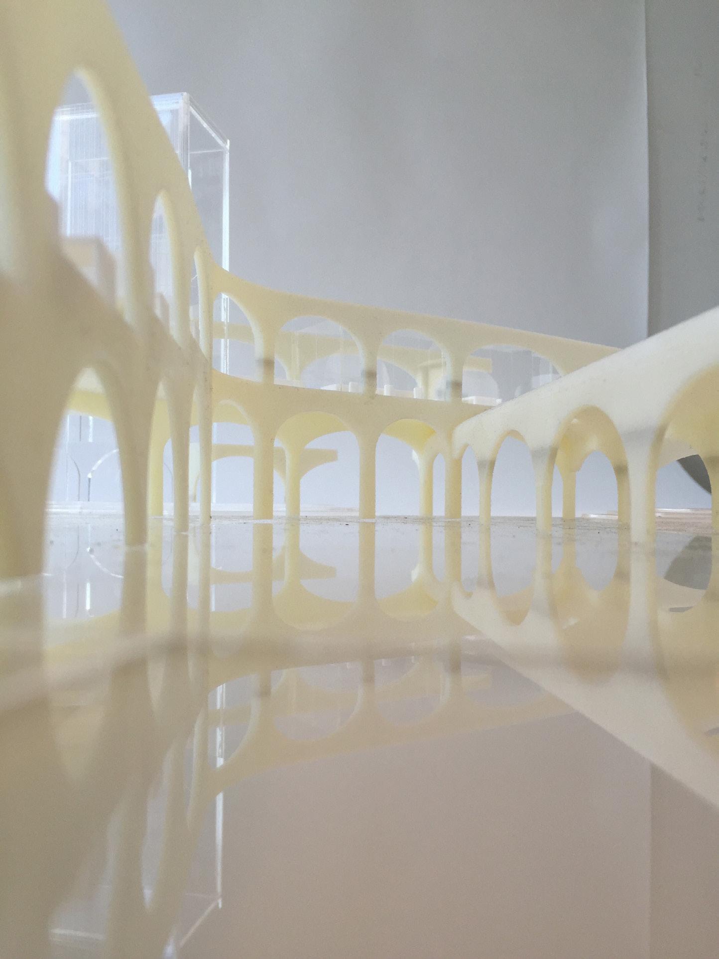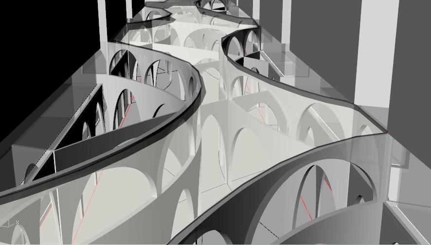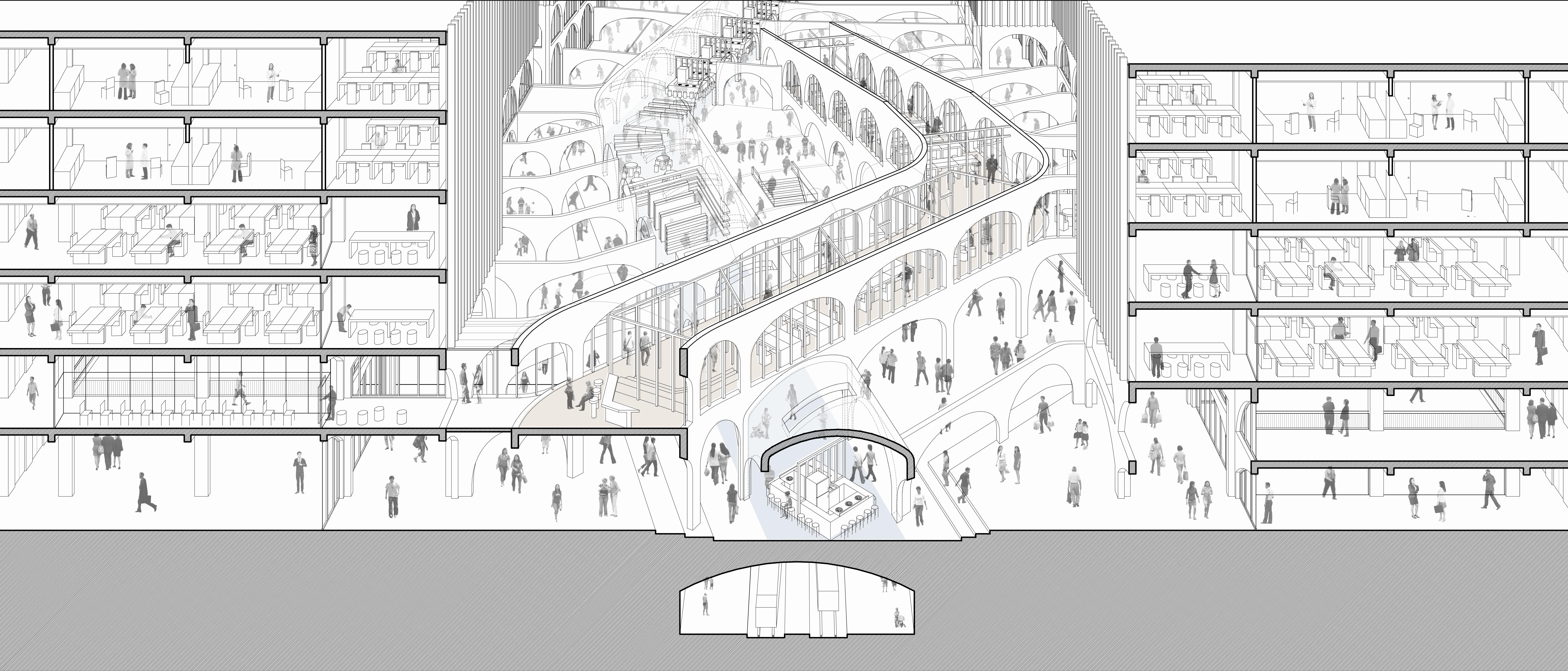 Albeit the space along this axis becomes a vertical urban campus on a new public transportation infrastructure, it is a new type of arcade space, refunding the inaccessible infrastructure line in the central block back to the public.(Fig. 45) Then, it enables the space to be capable of sewing up different deferent parts of the city. To achieve that, the proposal maintains the permeability on the ground level with layered interspaces. The axis’s edge is subsequently binded with colonnades and atrium spaces coupling with every building from the campus axis is enhanced.