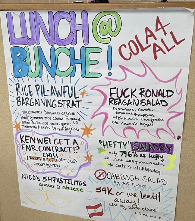 I was warmly welcomed to their group chat as the new cochair of the Dishwashing SubCommittee. My subsequent days on the picket line had their own routine: arriving at the picket, I’d go upstairs to the graduate student offices, brew as many pots of coffee as I could, and help set up breakfast at the picket line. I spent the next few hours running coffee pots down to our Thermos and bringing the empty pots up to refill. Along the way, I might help people who were cooking the day’s lunch, running errands and locating supplies or ingredients, or keep my eye on the appliances plugged into our generator. At noon, we served lunch, setting out platters and bowls along with a handdrawn menu that listed the day’s dishes with punny names and colorful drawings of ingredients. Each day, we served a fourcourse meal with nonvegetarian, vegetarian, and vegan/glutenfree components in order to meet everyone’s dietary needs. I’d grab a plate, to quickly eat, either in solitude or with friends, and then spend the rest of the day washing dishes from the morning’s cooking.