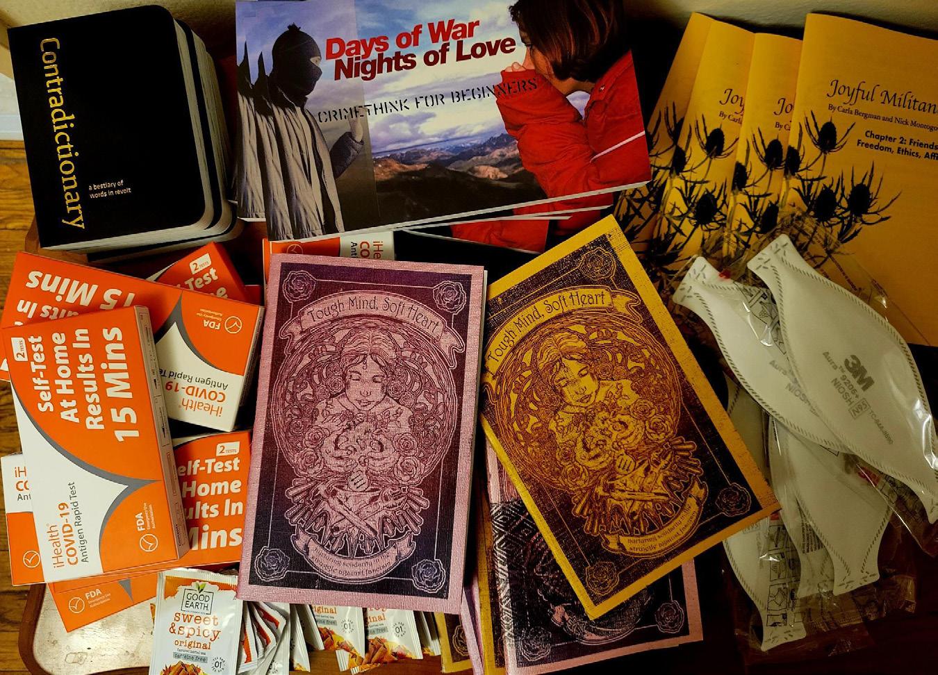 After the initial rebellions in Minneapolis started to die down, many people in our group weren’t sure how to show up well in these lulls. This was actually a really illuminating moment for us because it gave us time to strengthen our relationships (by spending time with one another for enjoyment and not for a meeting or with an agenda etc.), to read and discuss political literature (like reading a zine together, sharing thoughts, and realizing where you disagree and why), and lastly, to have the time to organize with more intention. Often, when things are “popping off,” it doesn’t feel like there’s time to organize well when things are unfolding so quickly. And if it’s urgent and rushed, you likely are leaving disabled folks out. Sprout and I were excited about the slower times so we could read together, gather and discuss texts, and start to get to know each other and how we envisioned building this new world. This gave us an opportunity to hear perspectives that didn’t have space to surface before. It gave us time to actually think, reflect, and change our minds! We started a group called Abolition is a Practice in April 2021, which is currently ongoing. We meet the second and last Friday of every month and decide together a text to discuss. We have a cryptpad (a more secure version of a Google doc) for people to write down topics, zines, books, and/or podcast episodes they want to talk about, and we create a poll once a month for people to vote on the suggestions. The first and second choices become the two topics for the month. We come up with some discussion questions, have people volunteer to record the resources for people in the chat that need or want that, and finally, if we are able to print the resources or make them into a zine, we offer zine deliveries. We have been delivering zines for over a year now, and it has become a beautiful vehicle for making sure people have masks, coloring sheets, mental health resources, and most importantly, candy, snacks, and sometimes even
