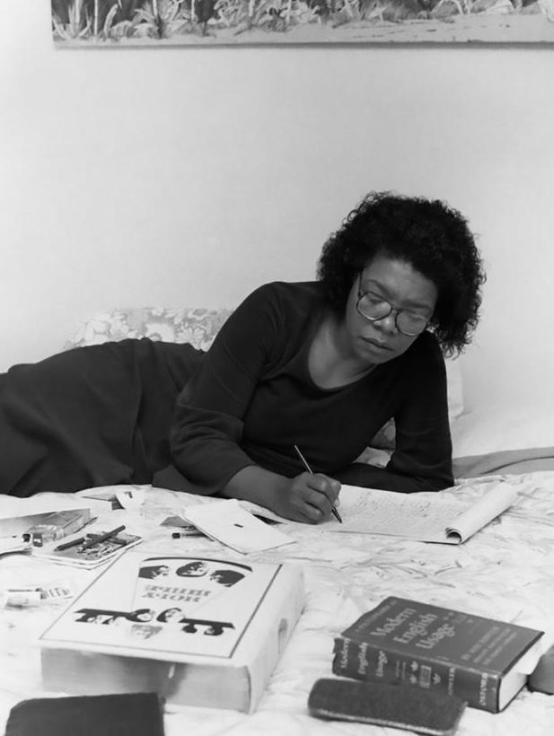 at home with her tools – a yellow legal pad, thesaurus, dictionary, and Bible, 1982.