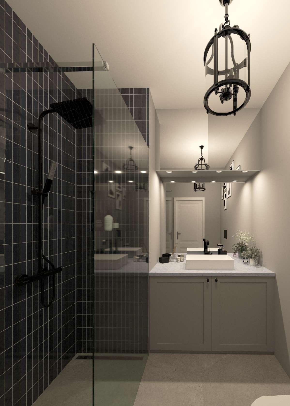 Dla rozświetlenia przestrzeni zostały zastosowanie płytki z połyskiem EQUIPE — Coco Blue Night.