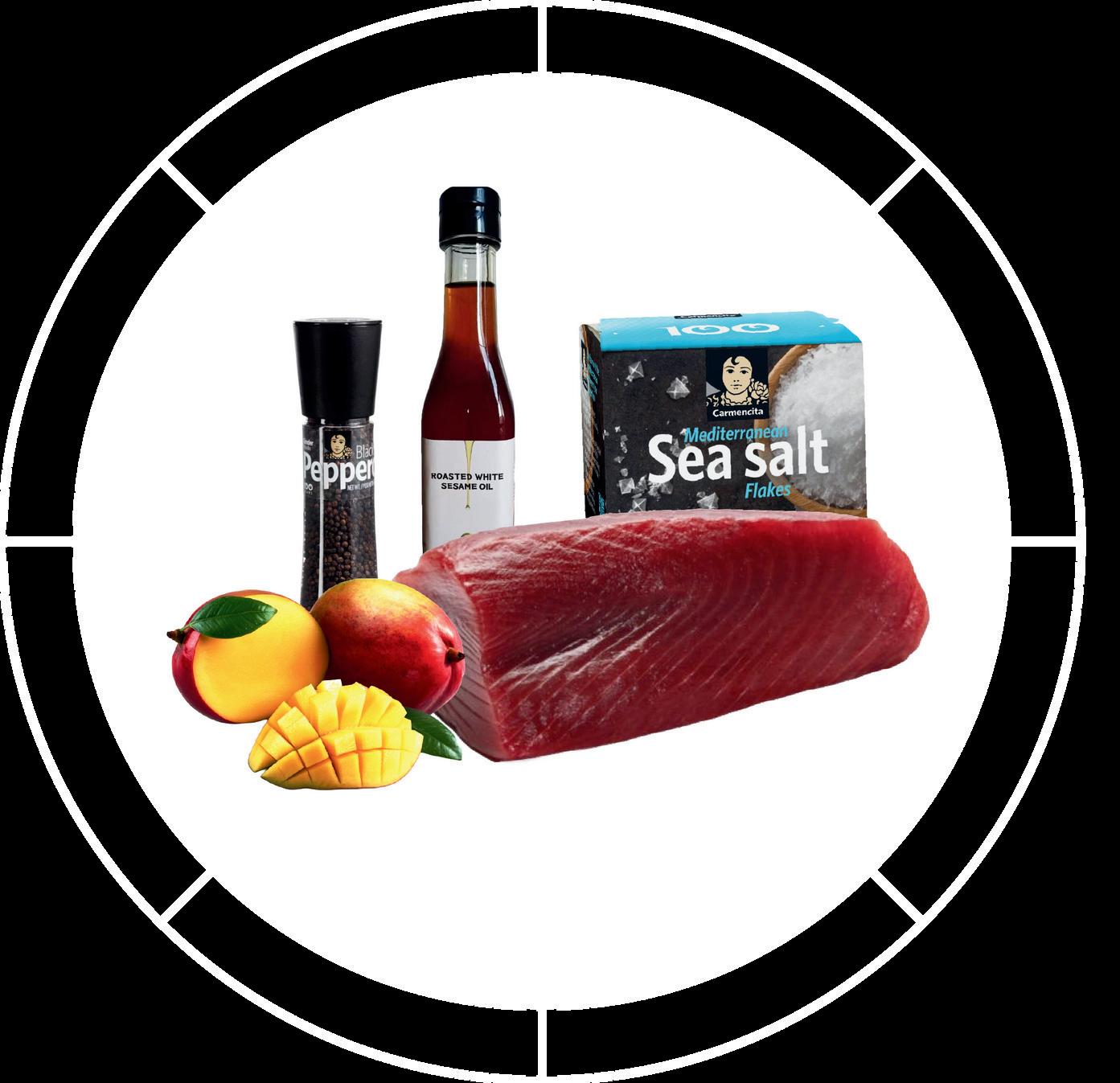 Ant tuno dėkite mangų salsą, pašlakstykite unagi ir sezamų aliejaus padažu, pagardinkite druskos dribsniais ir šviežiai grūstais pipirais.