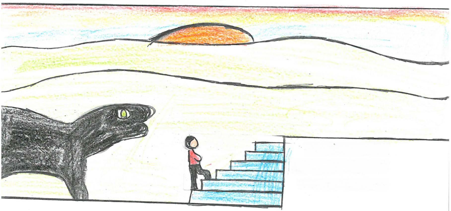 A miña historia comeza no 1600 e ten coma protagonista a un neno de doce anos. Era moi listo, e gustáballe escaparse da súa casa para ir ao seu lugar favorito, o monte. Na súa árbore preferida vivía o seu único amigo, un enorme dragón verde chamado Elmo que podía camuflarse ata facerse invisible. Ao neno Santiago e a Elmo gustáballes moito xogar e voar por riba das casas no solpor.