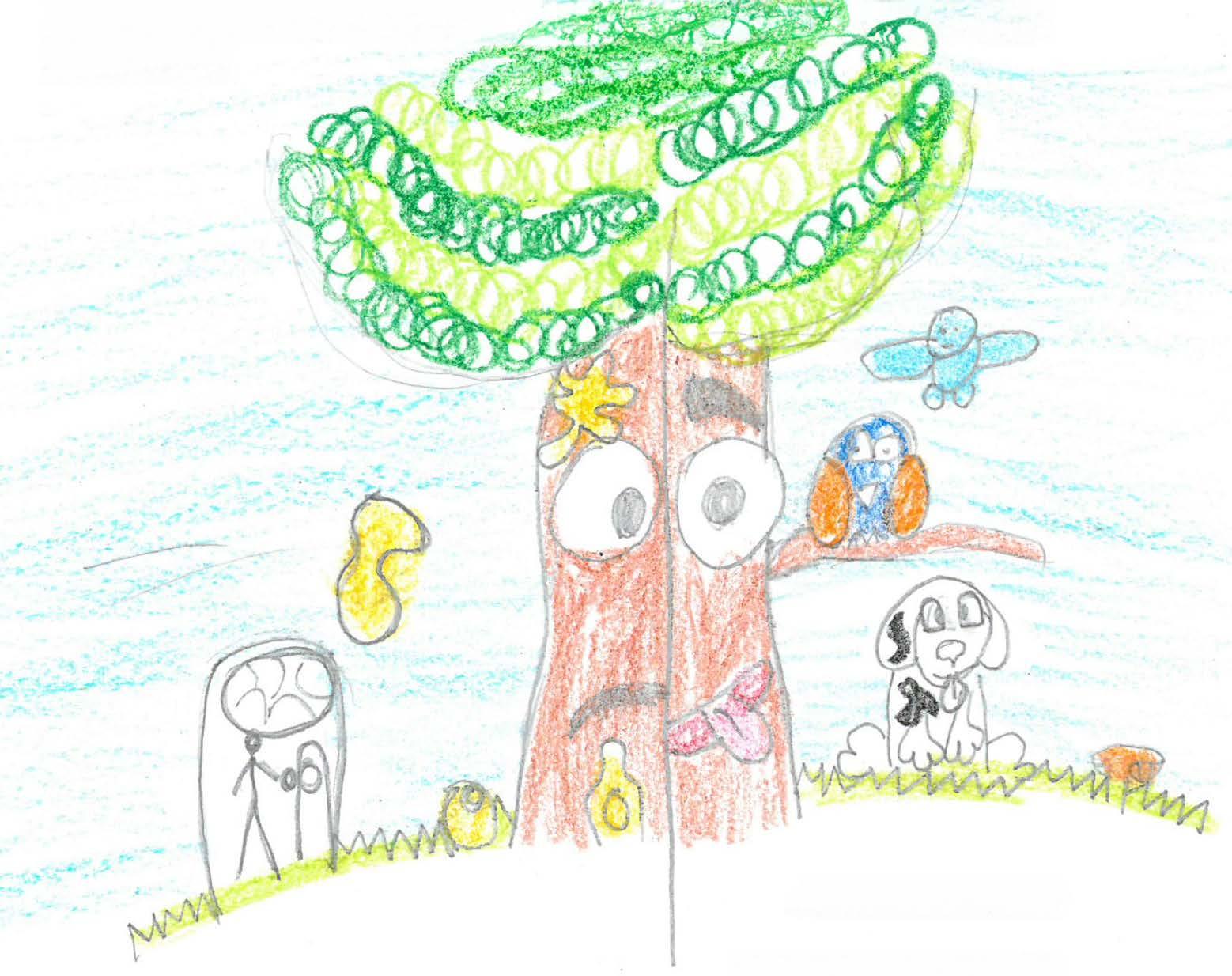A árbore preguntoulle ao esquío se o bosque volvería a normalidade. Este contestou que non; entón a árbore botouse a chorar. O esquío dixolle que todo iso era por culpa da xente sen escrúpulos.