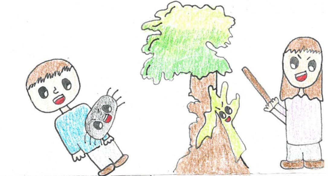 chegamos a un punto, no que estabamos rodeados e xa non había nada que facer. Botei a chorar e dinme conta que ia ter unha morte tráxica, cerrei os ollos por un intre, e cando os abrin, non daba crédito o que ali estaba sucedendo. Os animais do bosque estaban axudándonos a defendemos, eran os nosos aliados. Raposos trepando polos troncos, os paxaros poñéndose diante das pólas, para evitar o ataque, as ardillas tamén, coellos, cervos facendo de escudo diante nosa cos seus comos, que sei eu, infinidade deles que non son capaz de describir. Todo estaba sendo un caos, se a moura estaba castigándonos pola contaminación do mundo, o que ali estaba sucedendo, ainda era peor, unha guerra catastrófica. Pareime a analizar a situación e peguei un berro: PARADE! Formouse un silencio que tanto as árbores coma os animais e a miña familia observáronme. Comecei a falar moi pausadamente e dixenlles: vos percatades que por culpa dunha moura, estamos metidos neste berenxenal, que igual falando as cousas e buscando solucións, non temos que chegar a estes extremos. A miña familia máis eu, non temos porque morrer, e as árbores e os animais podedes seguir convivindo en harmonia, porque se non vos destes conta, as árbores sodes a vivenda de moitas aves e seres vivos, tamén o seu alimento, e se non fora pouco, producides osíxeno e sodes saneadoras de moitos males. Asi que deixémonos de facer o parvo, e mandemos unha mensaxe aos humanos para que fagan o corrrecto. De súpeto, o chan comezou a destrozarse e a abrir, decateime que íamos caer ao vacío, e co susto, espertei, e dinme conta que todo fora un pesadelo, pero isto fixome reflexionar, en que temos que buscar solucións entre todos para parar a contaminación.