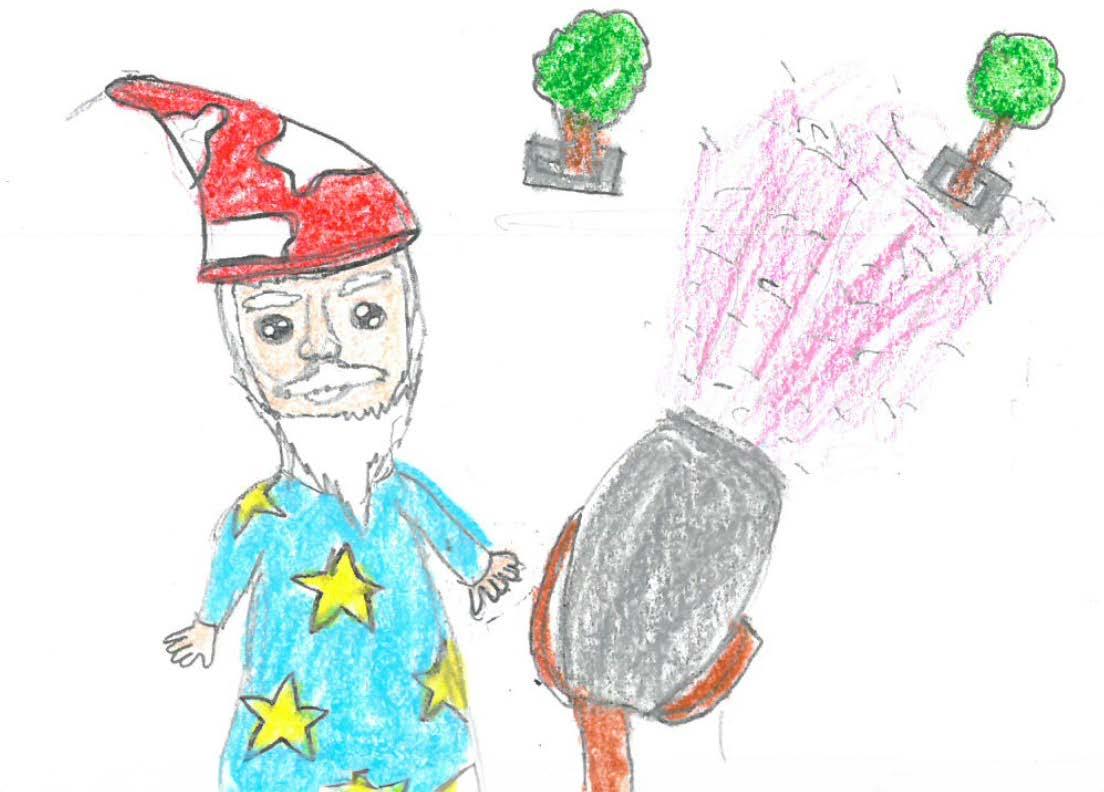Empezou tocando a fábrica, e ao momento podíase ver un ceo azul e un sol replandecente. Tocou os coches, desapareceu o cheiro a gasolina. Tocou o lixo e mirou camiñar a xente feliz sen pisar porcallada. E grazas a todo iso xa non había incendios nos bosques.
