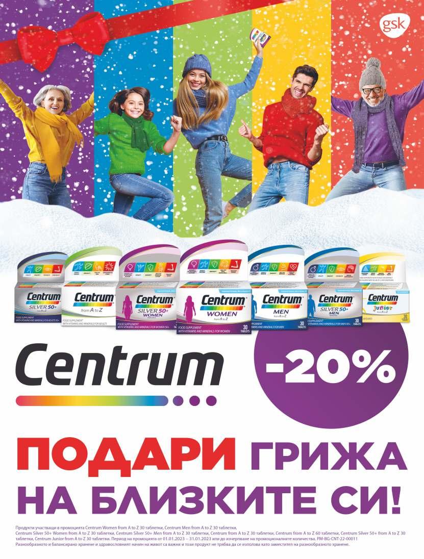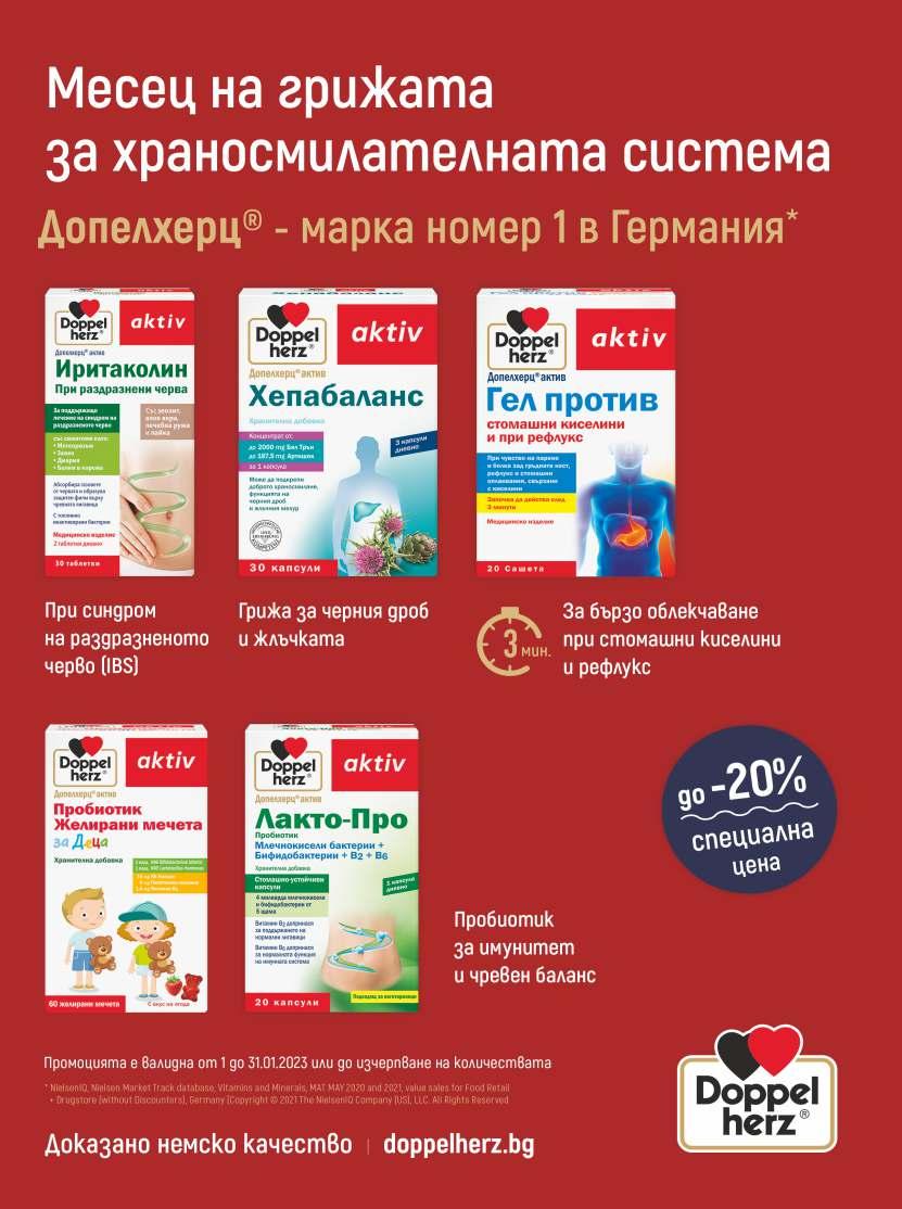 спокоен сън 9013, лв. 9016, лв. OTC Лекарствен продукт без лекарско предписание за лица над 12 години. Съдържа течен екстракт от корени ружа. Преди употреба прочетете листовката. А292/17.12.2015 ИАЛ номер: А0143/18.08.2020 OTC Терафлу Форте Простуда и Кашлица е лекарствен продукт без лекарско предписание за възрастни и юноши над 16 години. Съдържа парацетамол, фенилефринов хидрохлорид и гвайфенезин. Преди употреба прочетете листовката. A0293/09.12.2021; PM-BG-THRFL-21-00025 Търговски марки, притежавани или лицензирани от групата компании GSK. ©2021 Групата компании GSK или техен лицензодател. OTC Хюмексгрип е лекарствен продукт без лекарско предписание за възрастни и деца над 15 год. Съдържа парацетамол. Преди употреба прочетете листовката. Рег N о А0252 29.1 1.2018 OTC Промоционалните предложения са валидни от 1 .0 1.20 2 3 г. до 31. 0 1.20 2 3 г. или до изчернване на количествата. Всички цени са в лева с ДДС. Промоциите не са оферта по смисъла на гражданското право. Период на промоцията: 1.01.2023 г. - 31.01.2023 г.
