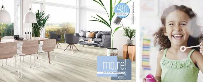 за производство на тези настилки, те вече могат да ви предложат предимства като антибактериалност (която не позволява развитие на микроорганизми), екологичност, защита от влага и петна, влагоустойчивост, висока устойчивост на надраскване и светлоустойчивост. Освен естетическите преимущества, съвременните ламинирани паркети и винилови настилки притежават и редица качества, които ги правят желани, сигурни, създаващи идеална среда в дома и всяко друго помещение. Иновативната технология MO.RE! на паркета на Кроношпан гарантира 48ч. защита при случайно разливане на течности. Технологията е базирана на нова формула, която прави пода значително по-малко податлив на подуване и
