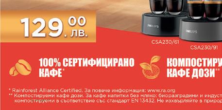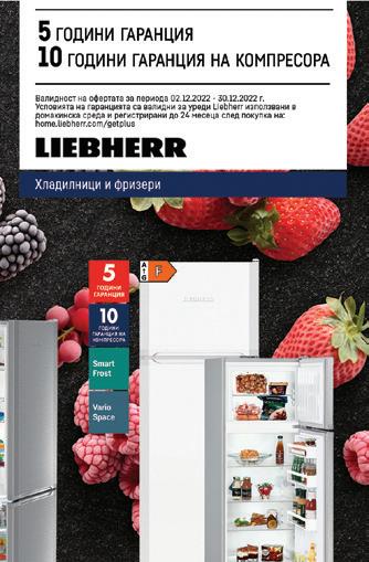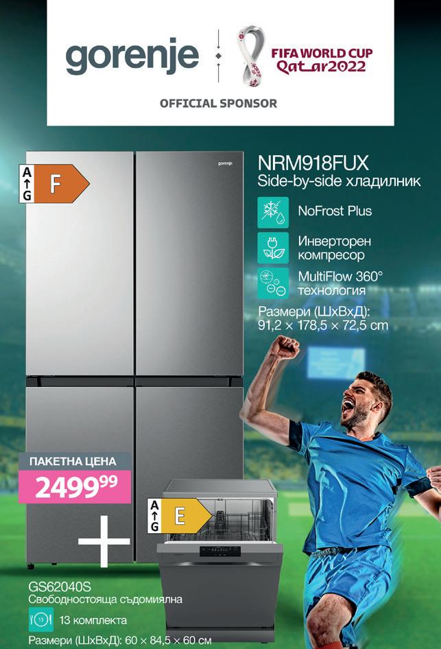 Предложенията са валидни от 02.12. до 30.12.2022 г. facebook.com/zora.bg instagram.com/zora_ltd zora.bg ÏÅÐÀËÍß EWC 71252 W EE N 829 ÏÅÐÀËÍß ÑÚÑ ÑÓØÈËÍß BDE 86435 9EWS EU 1400 об./мин. 45 cì ÏÅÐÀËÍß MTWA 81484 W EU 8êã 1400 об./мин. 599 ÑÚÄÎÌÈßËÍÀ DSFO 3T224 459 1200 об./мин. 579 P9 8 x 74,87 лв. 5 x 91,80 лв. 5 x 115,80 лв. 8 x 103,63 лв. *Важи след регистрация на www.dopulnitelnagaranzia.com в 30-дневен срок от датата на покупка. * X89J 50 / 55X89J* 4K Ultra HD телевизор • 50” (126 см) / 55” (139 см) размер на екрана • Процесор X1 • Triluminos Pro • Dolby Vision, Dolby Atmos • Motionflow™ XR 800 (100 Hz панел) • Аmbient optimization * 2-посочна мултипозиционна стойка за 55X89J ИДЕАЛЕН ЗА ГЕЙМИНГ ОТ НОВО ПОКОЛЕНИЕ VRR / ALLM Low input lag 1399 1499* + + Кафеавтомат KRUPS Intuition Preference EA8738 + 1 кг кафе Lavazza Oro • Quattro Force технология за безупречно кафе • Интуитивно управление със светлинен индикатор • Система за мляко • 3.5 инча TFT сензорен дисплей • 11 рецепти Кафеавтомат KRUPS Arabica EA8170 + 1 кг кафе Lavazza Oro • Пaтентована Thermoblock система • 15 bar налягане + дюза за пара • Подвижен контейнер за вода 1.7л • Кафемелачка с 3 степени на смилане • 3 температурни настройки 99900 лв. 59900 лв. 11 x 90,81 лв. 5 x 119,80 лв. Galaxy A13 • DUAL SIM • 6.6" (~16.76см) FHD+ Infinity-V дисплей • Осемядрен процесор • 128GB вградена памет • 4GB RAM • OS ANDROID 12 • Основна камера: 50MP+5MP+2MP+2MP • Предна камера: 8MP • Сензор за пръстов отпечатък • Батерия: 5000 mAh 319.00 5 x 63,80 лв. 5 x 71,80 лв. 11 x 95,36 лв. 11 x 127,18 лв. 11 x 136,27 лв.