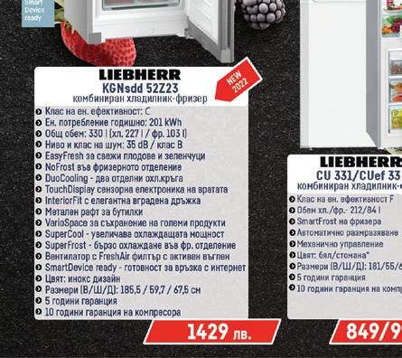 Валидни от 02.12. до 30.12.2022 ВСИЧКО, КОЕТО ПОИСКАШ 0700 10 375 *BDSK (*2375) ДВА МЕСЕЦА БЕЗ ЛИХВА СЪС СТОКОВ КРЕДИТ ОТ БАНКА ДСК СРОК НА ПРОМОЦИЯТА: от 02.12.2022 г. до 30.12.2022 г Размер на кредита: 350 — 10 000 лв. Срок на кредита: 12 месеца. Първите 2 месеца — ГПР — 0%, фиксиран ГЛП — 0%; останалите 10 месеца — месечно оскъпяване — 1,93%, ГПР – 31,54%, фиксиран ГЛП — 40,00%. ПРИМЕР: Цена на стоката: 1 000 лв. Размер на кредита: 1 000 лв. Срок на изплащане: 12 месеца. Годишен фиксиран лихвен процент: за първите 2 месеца — 0 %, за останалите 10 месеца — 40%. Годишен процент на разходите: за първите два месеца — 0%, за останалите 10 месеца — 31,54% при 30дни до първа вноска. Вноски: 12 броя — първите 2 x 83,33 лв., останалите 10 x 99,36 лв. Обща сума, дължима по кредита: 1 160,28 лв. Общото оскъпяване по кредита е в размер на 160,28 лв. Промоцията важи за всички стоки предлагани във физическите обекти на търговеца. 191 см E A G W7X 82O OX H Хладилник с фризер • Обем: 335 л (231/104) No Frost • Енергиен клас: E • Kонсумация (kWh/година): 252 • 6-th Sense • LED осветление • Размер: 191,2х59,6х67,8 см • Цвят: инокс 1099.99 335л. kWh година 252 no frost 179 см GSJV91BSAE Хладилник с фризер • Обем: 635 л (416/219) • Енергиен клас: Е • No Frost • Kонсумация (kWh/година): 350 • Външен дисплей • Инверторен компресор с 10 години гаранция • Диспенсер за студена вода • Външен ледогенератор • Размер: 179х91,3х74,5 см • Цвят: Инокс 2899.99 E A G 635л. kWh годин 350 no frost дисплей 91,3 см FXCA FD620PUREBDF Хладилник с фризер • Обем: 488 л (322/166) No Frost • Енергиен клас: F Kонсумация (kWh/година): 382 • Стъклени полици и рафтове PureBeam+ • Twist IceMatic • Диспенсер за студена вода • LED осветление • Размер: 179х84х69 см • Цвят: Инокс 1349.99 kWh годин 382 488л. no frost дисплей PureBeam+ пречистваща система с UV лъчи и активен въглен F A G 11 x 122,73 лв. 20 x 145,00 лв. 195 см 70 см kWh година 364 462л. no frost HA70BE 31X Хладилник с фризер Обем 462 л (309/153) No Frost • Енергиен клас: F Външен дисплей Kонсумация (kWh/година): 364 Стъклени полици и рафтове Active Fresh SUPER FREEZE • MultiCool Flow Fresh Zone+ LED осветление Размер: 195х70х75,5 см Цвят: Инокс 1249.99 F A G 186 см kWh годин 238 326л. no frost KGN36VLED Хладилник с фризер • Обем: 326 л (273/89) Енергиен клас E • Kонсумация (kWh/година): 238 NO FROST Дисплей • Стъклени полици и рафтове • Полица EasyAccess • VitaFresh • LED осветление • Размер: 186х60х66 см • Цвят: Inox 1249.99 E A G RB38T630ESA/EF Хладилник с фризер • Обем 386 л (272/114) • No Frost Енергиен клас: E • Kонсумация (kWh/година): 264 • Инверторен компресор с 10 години гаранция • Диспенсер за студена вода • Дисплей в хладилната част • Размер: 203х59,5х65,8 см 1199.99 no frost kWh година 264 386л. 203 см E A G kWh годин 254 344л. no frost дисплей 185 см RB34T670ESA/EF Хладилник с фризер • Обем: 344 л (230/114) Енергиен клас: E • Kонсумация (kWh/година): 254 No Frost • Инверторен компресор с 20 години гаранция • LED осветление • Размер: 185,3х59,5х65,8 см • Цвят: Инокс 999.99 E A G kWh годин 299 295л. no frost 186 см 59,5 см FKM295FIR0BG Хладилник с фризер Обем 295 л (207/88) • No Frost Енергиен клас: F Kонсумация (kWh/г): 299 • Външен дисплей Вентилатор в хладилната част LED осветление Размер: 186х59,5х60 см Цвят: Инокс 799.99 F A G 185 см RK6192EW4 Хладилник с фризер Обем 314 л (205/109) Енергиен клас: F Kонсумация (kWh/година): 294 LED осветление Стъклени полици и рафтове Размер: 185х60х60 см 689.99 kWh година 294 314л. F A G kWh година 301 339л. LI8 S1E W Хладилник с фризер • Oбем: 339 л (228/111) • Енергиен клас: F • Kонсумация (kWh/година): 301 • LED осветление • Размер: 189х60х66 см • Цвят: бял 679.99 189 см F A G 180 см SJ-BA05DTXWE/ SJ-BA05DTXLE* Хладилник с фризер • Oбем: 270 л (195/75) • Kонсумация (kWh/г): 224 • Nano Frost Wine Rack • Размер: 180x54x59,5 см • Цвят: бял/инокс* 669.99 699.99* kWh годин 224 270л. E A G години гаранция no frost SJ-BB04DTXWF Хлад