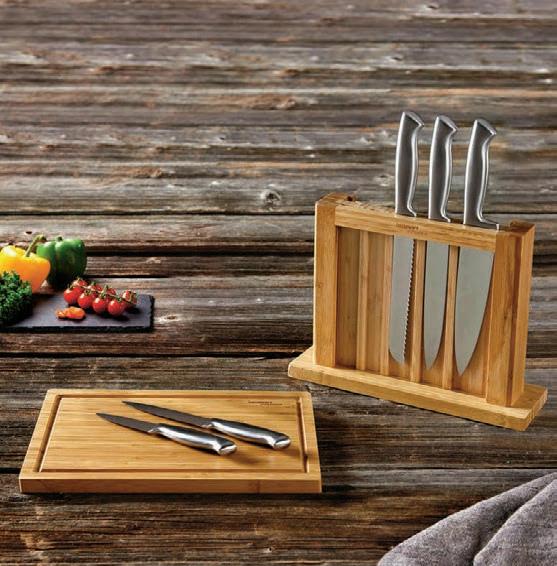 2: Комплект ножове със стойка и дъска 7 части, 1 бр. универсален нож 12 см , 1 бр. нож за хляб 20 см, 1 бр. готварски нож 20 см , 1 бр. нож за белене 8.8 см, 1 бр. нож за транжиране 20 см, 1 бр. дървено кубче за ножове, 1 бр. дъска за рязане, вид на дървото: бамбук 109,- 69,90 ( 48267040050 )