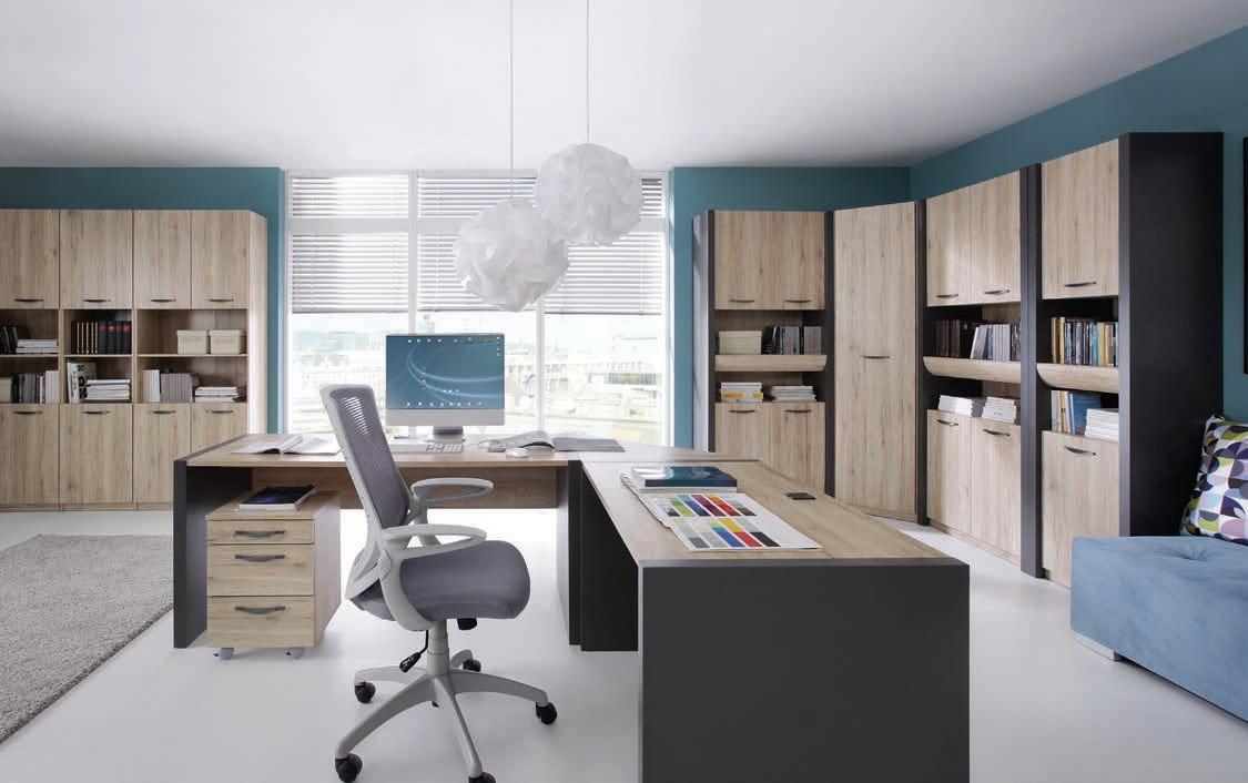 1: Oфис система Eкзекютив е идеална за хора, които следват модните тенденции. Масивната конструкция на мебелите прави стаите да придобият необичаен характер, а работата в тях да бъде истинско удоволствие. Състои се от 12 елемента - 2 размера бюра, открити етажерки и шкафове с различни размери и функции, благодарение на които можете да подредите всеки интериор.