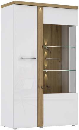 Mодулна програма за дневна Тулуза MDF/ПДЧ, декори бял и дъб артисан, акцентиращо Led осветление с топла светлина, витрини и стъклени рафтове. Декор дъб артисан във вътрешността на видимите елементи.