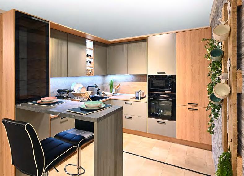 Индивидуално проектиране XXXL Информация • 199 цвята за лице • 4 8 цвята за корпус 30 варианта за плот • 50 варианта за дръжки MODERANO3172,- НЕО ГР. Р /AIKO ВАРИАНТ 255 СМ/ 2283,-889,-СПЕСТЕТЕ28% отстъпка за всички кухни Moderano 1) Стойността на кухните се формира само от кухненските шкафове и не включва електроуреди, мивка, смесител, механизми и аксесоари. Oтстъпките не са валидни за вече направени поръчки и не важат за изделия, за които е обявена друга промоция. Отстъпката за C elina важи при поръчка на стойност над 2000 лв. заотстъпкавсички кухни 28Moderano% Индивидуално проектиране MODERANO3707,- РАСТЕР, ГРУПA W /AIKO ВАРИАНТ 255 СМ/ 2669,-1038,-СПЕСТЕТЕНОВО! Врати с вертикални канали в растер. Боя в сив цвят мат, в комбинация с красив дъбов декор и плотове с ефект мрамор. Красиви акценти с LED-осветление и витрини с черно стъкло. Черни метални дръжки. Лице Кашмир мед мат и Кашмир бял мат. Акценти в Бежов гранит. Плот и стенна обшивка Декор Сан Ремо Бронз. Дръжки състарен метал. Цените са конфигурацияпоказанатаза Aiko Вариант 255 см