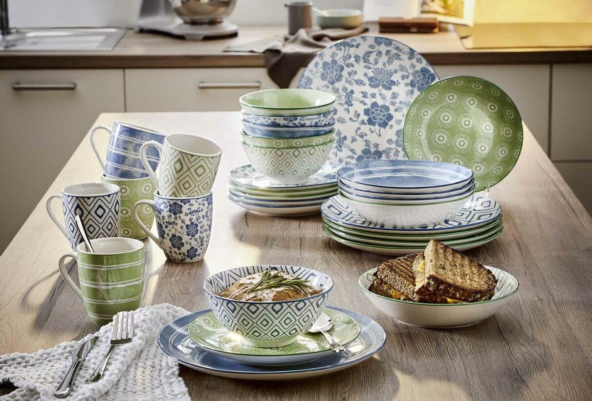 Неръждаема стомана 18/10 99,90 5 ПРИБОРИ ЗА ХРАНЕНЕ 24 ЧАСТИ 5990 40% СПЕСТЕТЕ 1: Комбиниран сервиз 30 части изработен от керамика и порцелан в синьо, зелено и бяло, състоящ се от 6 различно декорирани комплекта за индивидуално сервиране - 6 бр. дълбоки чинии за супа Ø20,2 см, 6 бр. чинии за основно ястие Ø26,5 см, 6 бр. десертни чинии Ø20,2 см, 6 бр. купички за зърнена закуска Ø15,5 см, 6 бр. чаши за топли напитки 330 мл 179,- 119,- ( 48268020149 ) 5: Прибори за хранене 24 части 6 бр. вилици, 6 бр. ножове, 6 бр. лъжици, 6 бр. малки лъжички. Дебелина на приборите 3 мм, изработени от неръждаема стомана 18/10 99,90 59,90 ( 51768050016 )3: Чаша за безалкохолно 499 мл 11,99 7,99 ( 36968030295 ) 4: Чаша за алкохол 400 мл 9,99 6,99 ( 36968030294 ) 9,99 4 ЧАША ЗА АЛКОХОЛ 400 МЛ 699 30% СПЕСТЕТЕ 11,99 3 ЧАША ЗА БЕЗАЛКОХОЛНО 499 МЛ 799 33% СПЕСТЕТЕ Кристално стъкло Порцелан 2: Чаша за вода 500 мл 11,99 7,99; за бяло вино 363 мл 11,99 7,99; за червено вино 535 мл 11,99 7,99 ( 36968030251 - 3 ) кристално стъкло 11,99 2 ЧАША ЦЕНА ЗА 1 БР. 799 33% СПЕСТЕТЕ 179,1 КОМБИНИРАН СЕРВИЗ 30 ЧАСТИ 119,33% СПЕСТЕТЕ