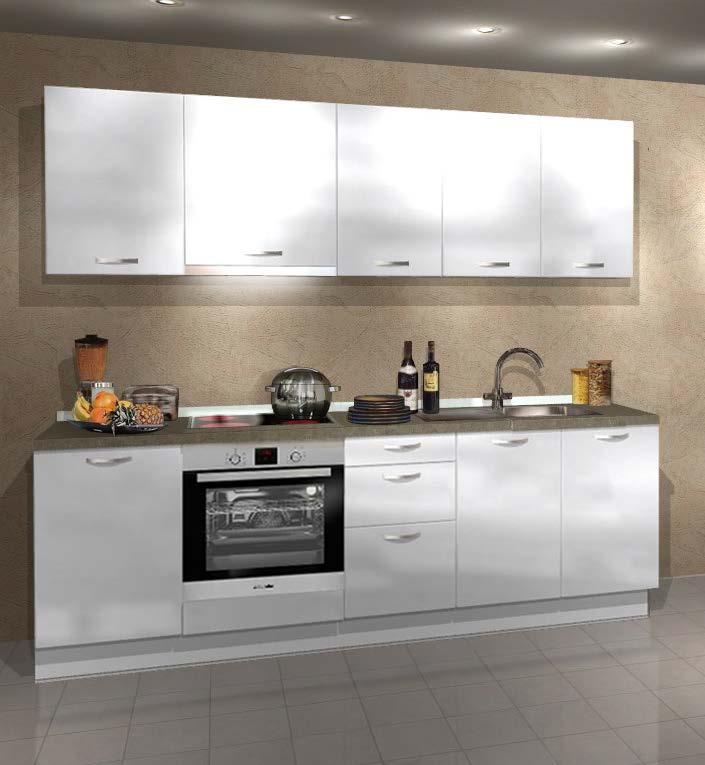 Линейна блок кухня с включени електроуреди, мивка и смесител с размери Ш:300/Д:60/В:216 см. Модерна и функционална с красива визия цялостно моделирана и произведена в Италия. Отличава се с наличието на шкаф килер за съхранението на хранителни продукти, хладилен шкаф, както и термоустойчив плот. Много практично и удобно в зависимост от разположението в помещението има възможност за поставяне на високите модули отляво или отдясно на кухнята. Моделът е напълно завършен, като спокойно може да приложите всичките ви кулинарни умения и да приготвите любимите ви ястия или просто да забъркате нещо набързо. Качествената и прецизна изработка на всички шкафове гарантира дългогодишна експлоатация, а модерната комбинация на цветове и декори (сив дъб и бял мат), дава отлична възможност за комбинация с други видове мебели за дневна и трапезария. Всички шкафове са сглобени и с монтирани в тях електроуредите, мивката и смесител.