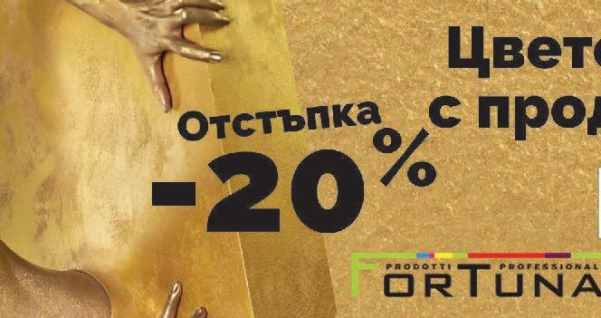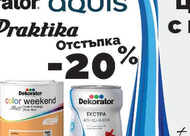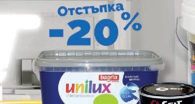 4| ПРАКТИЧНО 499лв. АКРИЛ TYTAN PROFESSIONAL ТУРБО • разфасовка:280 мл.; бял • уплътняване в ъгли между стени и тавани, около врати, прозорци, первази, декоративни корнизи и др. • запълване напукнатини и фуги пофасади и тавани /98577/ ПАКЕТ ПРОМО ЛЕПИЛО МОНТАЖНО MOMENT EXPRESS FIX - 2 Х 375 гр. • за употреба на закрито и открито; залепва голямо многообразиеот материали - дърво, камък, гипс, тухли, цимент, корк, керамика,шперплатметал,и др. /84848/ 1449лв. ------ www.alati.bg -----859лв. СИЛИКОН УНИВЕРСАЛЕН MOMENT • разфасовка:280 мл. • бял, прозрачен • за уплътняване на прозорци и врати, стъклени вани, мивки, /78695,78694/фуги,оборудване,санитарностроителнифугипосградиидр. от 949лв. БОЯ ЗА ВЛАЖНИ ПОМЕЩЕНИЯ • разфасовка:1 л.- 9,49 лв., 4 л.- 30,90 лв., 10 л. -69,90 лв. • за помещения сповишенавлажност, при коитоможе да се появи мухъл иплесен • разход: 10 /83483,83484,83485/м2/л. ЛАТЕКС COMFORT COLOR • разфасовка:2,5 л. • различни цветове • замазилка,гипсокартон,минералнабетон • разход: 10 13 м2/л./слой /80918,80882/ от 1579лв. АЛКИДНА БОЯ 3 в 1 DEKORATOR • разфасовка:500 мл. • различни цветове • нанасяседиректно върху ръждата, като я пасивира и елиминира остатъчната влага • разход:80- 120 /102332,102337,102334/мл./м2 от 969лв. ЛАТЕКС ДЕКОРАТОР СРЕБЪРНИ ЙОНИ + БЕЗПЛАТНО ТОНИРАНЕ • разфасовка:2,5 л. -19,99 лв., 4 л. -29,99 лв., 8,5 л. -59,90 лв., 15 л. -99,90 лв. • за помещения сповишенавлажност • цвят иефект: бял, мат • 90- 100 мл./м2 за сл. /102272,102273,103725,103724/ от 1999лв. ИНТЕРИОРНА БОЯ AMАДЕУС • разфасовка: 12 кг. • цвят: бял • /63555/задишаща,разход:4м2/кг.единслойвзависимостотвиданаосновата 979лв. на основата ИНТЕРИОРНА БОЯ ЛЕКО + ПОДАРЪК • разфасовка:8,5 л. -50,90 лв. + ПОДАРЪК 1,5 л. • 15 л. -87,90 лв. + ПОДАРЪК 2 л. • за стении тавани в закритипомещения • цвят: бял • покривност: 5-7м2/кг. /94768,94769/ от 5090лв. СИЛИКОН TYTAN САНИТАРЕН • разфасовка:280 мл. • отлично прилепяне към санитарни повърхности, особено към глазирана керамика • устойчив към почистващи препарати • предпазваот плесен • бял, /98125,98126/прозрачен 699лв. от 879лв. от 729лв. АВТОЕМАЙЛЛАК • разфасовка: 0,8кг. • различни цветове • за боядисване на автомобили • може да се използва и за боядисване на дървени и метални повърхности • разход:60- 110 гр./м2 /81571, 81441,81442/ 819лв. СПРЕЙ НА ВОДНА ОСНОВА НОВАСОЛ ХОУМ • разфасовка:400 мл. • различни цветове • за вътр. ивъншно ползване • за боядисване насекции, врати, прозорци,шкафове, маси, столове и /100155,100156,100157/др. от 829лв. ПЯНА МОНТАЖНА РЪЧНА ПИСТОЛЕТНА SOUDAL • разфасовка: 750 мл.; цвят: жълт • ръчна-9,49 лв. • пистолетна-8,29 лв. • монтаж и уплътняване на каси, врати и прозорци • за изолационни материали, покривни конструкции и др. /68326, 91010/ ЛАК ЛАЗУРЕН • разфасовка:650 мл. • различни цветове • за дърво • за декорация и защита на прозорци, врати, огради, балкони, вили, ламперии и др. • покривна способност: 10 12 кв. /65433,65434,65435/м./кг. 749лв. СРЕБЪРЕН ФЕРОЛИТ • разфасовка: 750 гр. • за антикорозионна дейност и декоративна защита на метални повърхности • покривна способност: 10 /65430/кв.м./кг ИМПРЕГНАНТ ЗА ДЪРВО ГОТОВ ЗА УПОТРЕБА BOCHEMIT OPTIMAL • разфасовка:1кг. • кафяв, безцветен • покривност: 5м2/кг. • за дълготрайна защита на дървесина от плесени, термити, дърворазрушаващи насекоми и /105060,106141/гъби 1099лв. 1069лв. БОЯ КОПРИНЕНА AQUIS • разфасовка:650 мл. • различни цветове • по-мекии приглушени цветове, които позволяват прекрасно съчетание с интериорнитерешения • разход:80- 100 мл./м2 за /103751,103752,103754/слой ДЕКОРАТИВНО ПОКРИТИЕ SABBIA PRONTO • разфасовка:2,2 л. • различни цветове • дишаща,раз
