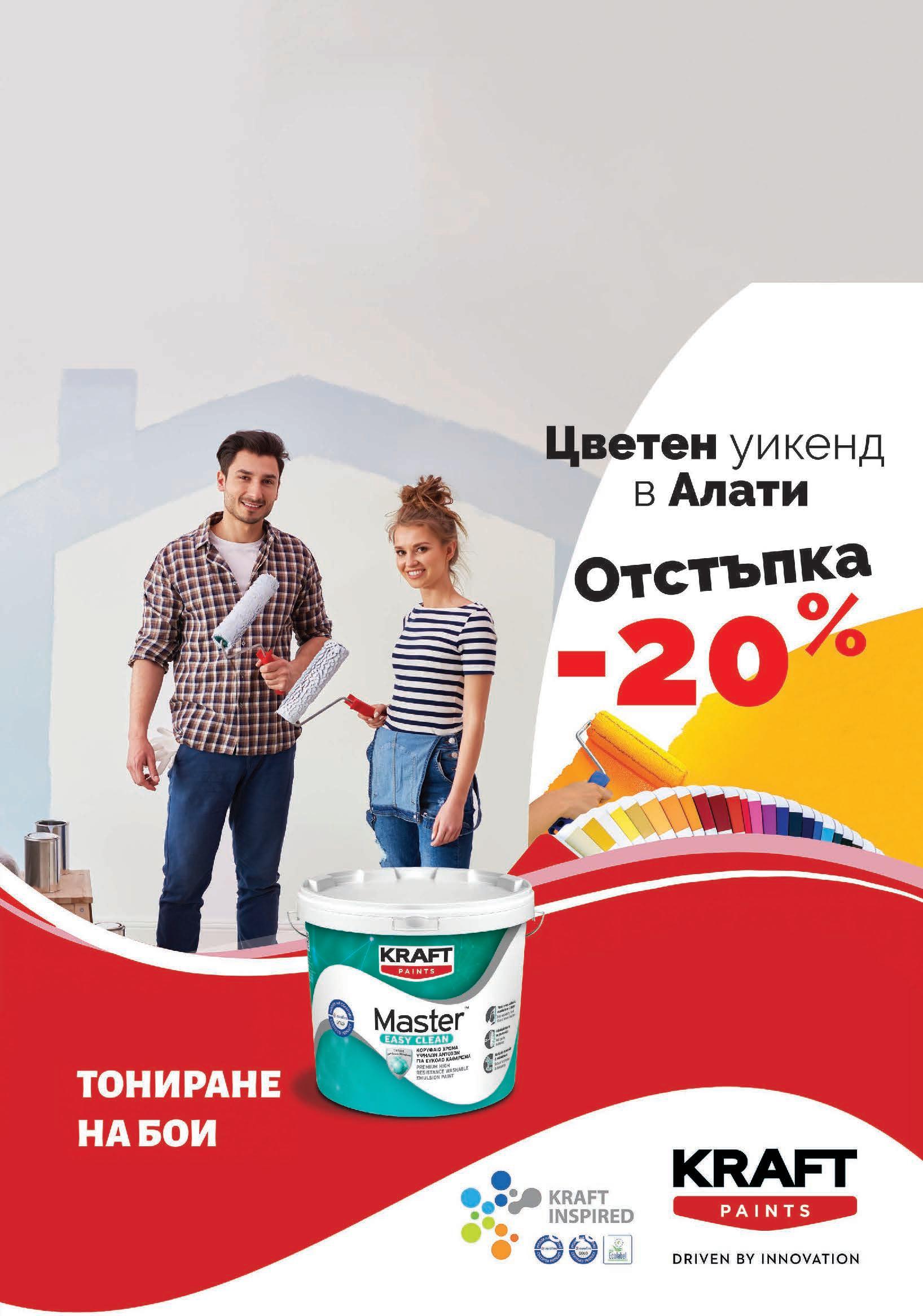„Алати" си запазва правотода коригирапубликуваната информация. Някои артикули е възможно да бъдат изчерпаниоще в първия ден на промоционалната брошура. Ценитеважат до изчерпване на наличните количества. Поради технически особености припечат е възможно изобразенитецветоведа се отличават от оригиналните. Възможни са неточности и печатнигрешки в изображенията и текста. В обявените цени не са включени декорация, доставка доадрес, материали и консумативи за монтаж. Част от предлаганите продукти се продават разглобени и са предназначени за самостоятелен монтаж. ПОСОЧЕНИТЕ ЦЕНИ В БРОШУРАТА СА В ЛВ. С ДДС. автобуси: 14,14а, 20,22,118,148,209 |маршр. кола: 120 | тролей: 83,88 www.alati.bg автобуси: 4, 18, 20,44,222 лв./бр. тонираненабои продажбинаедро разкрояванениски цениспециалнипоръчки банкомат на изплащане снек бартранспорт безплатенпаркинг персоналвежлив УСЛУГИ В СТРОИТЕЛНИ ХИПЕРМАРКЕТИ АЛАТИ v гр. Пловдив| бул. България 125 понеделник - събота: 08:00-20:30 неделя: 08:30-20:00 телефони за контакт:032/904556 гр. Варна | бул. Трети март 30 А понеделник - събота: 08:00-20:30 неделя: 08:30-20:00 телефони за контакт: 052/59 57 21 052/59 57 14 • При поръчка на стойност над 200 лв. с ДДС на телефона на физическия ни магазин в гр. Пловдив, получавате безплатна доставка в рамките на града. @alatibg