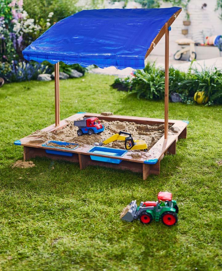 Sandkasten mit Dach Echtholz; Dach höhenverstellbar, UV-Schutz 40; inkl. Bodenvlies; mit herausnehmbarem Wasserbecken; für ca. 100 kg Spielsand; B × H × T: ca. 126 × 118 × 121 cm; Stück