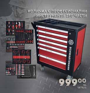 V • Kапацитет на батерията: 2 x 2.0 Ah • Тип батерията: Li-Ion • Мощност: 450 W • Обороти: 600-3000 об./мин. • Дълбочина на рязане: - в дърво: 65 мм - в алуминий: 18 мм - в стомана: 6 мм • Бърза смяна на ножчето 12900 лв. 530075 ВЕРТИКАЛЕН ТРИОН STEB 65 QUICK 25900лв. 516509 • Мощност: 800 W • Захр. напрежение: 220 V/50Hz • Обор. на празен ход: 0-1230 об./мин. ПЕРФОРАТОР SDS+KOMBI KHE 2444 • Мощност: 2300 W • Обороти: 4000 об./ мин. • Размер на диска: 355 мм СТАЦИОНАРЕН ЪГЛОШЛАЙФ + ДИСК 355 мм 40900 540082 лв. ЪГЛОШЛАЙФ 125 ММ 750 W 9900 лв. 583295 • Захранващо напрежение: 230 V • Mощност: 750 W • Об. на празен ход: 11 500 25900 521961 лв. • Мощност: 1 200 W • Обороти: 5 600 об./мин. РЪЧЕН ЦИРКУЛЯР KS 55 FS ЕКСЦЕНТЪРШЛАЙФ FSX 200 13900 лв. 526681 • Мощност: 240 W • Вибрации: 11 000мин-¹ • Размер на плота: Ø125 мм • Ексцентритет: 2.7 мм 1499 лв. 78568 КЛЕЩИ ЗА МАСЛЕН ФИЛТЪР • Дължина: 60-90 мм. • Размер 10” 1899лв. 16573 ПРОБКИ FORCE /5051/ 9412057 КЛЮЧ ЗА МАСЛЕН ФИЛТЪР С ВЕРИГА 40 - 120 ММ 1799лв. 566833 • Размери: ф 40-120 мм • Дължина: 150 мм 2999лв. 35946 ТРЕСЧОТКА 1/2” 270 мм/15/80242 • Тресчотка с 24 зъба • Захват: 1/2” • Дължина: 270 мм 24099лв. 150 части 506085 КОМПЛЕКТ ГЕДОРЕ 5499лв. 20 части 507328 КОМПЛЕКТ ВЛОЖКИ И БИТОВЕ 1/4”1/2” 4941-5 FO 15999 лв. 14396 • 94 части
