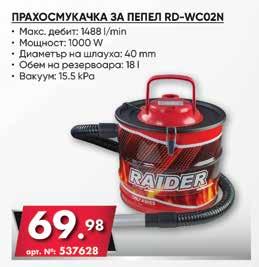 • Мощност: 1400W • Блокировка на вала • Максимални обороти: 1000-3300 об./мин. • Диам. на диска: 180 мм • Напрежение: 220V/50Hz 547663 11599 лв. ПОЛИРМАШИНА • Двигател: двутактов, с въздушно охлаждане • Обем: 61.5 см³ • Мощност: 3.3 к. с. / 2.4 kW • Капацитет на резервоара за гориво: 550 мл РЕЗАЧКА БЕНЗИНОВА 61.5CC 22” 25899лв. 582947 • Мощност: 900 W • Об.: 11 000 об./мин. • Диам. на шлиф. диск: 115 мм 547658 7699 лв. ЪГЛОШЛАЙФ DAAG115-90 • Мощност : 1200 W • Захр. напрежение : 230 V / 50 Hz • Обем на торбата: 20 л • HEPA филтър ПРАХОСМУКАЧКА ЗА ПЕПЕЛ DAAVC 1200 - 20 L 8699лв. 573612 ДОМАКИНСКА НОЖИЦА HG 53576 ПОДАРЪК ПОДАРЪК СТЯГА XG53758 ПОДАРЪК 17099 лв. 562425 ЕЛЕКТРИЧЕСКИ ЦИРКУЛЯР DACS1800 • Мощност: 1800W • Об.: 4500 об./мин. • Размер на диска: 210 мм. • Настр. на ъгъла на рязане: от 90° до 45° ПРЕДПАЗНИ ОЧИЛА XG53214 ПЕРФОРАТОР DARH-26SRE 800W • Мощност: 800W • Напрежение: 240V • Честота: 50-60Hz • Обороти на празен ход: 0 – 1100 об./мин. 11999лв. 590997 МАГНИТЕН ДЪРЖАЧ Е9XG53664 ПОДАРЪК АКУМУЛАТОРЕН ВИНТОВЕРТ 5599лв. 557319 - напрежение: 10.8 V - батерията: 1300 mAh / Li-ion - обороти: 0 - 550 об/мин - макс. въртящ момент: 18 Nm - степени на въртящ момент 19 + 1 • PlatinumTools инструменти произведени в Германия, в алуминиев куфар с колелца и изтегляща се дръжка, • Размери: 38,5 х 24,5 х 50 см лв.28900 587821 КОМПЛЕКТ КУФАР С ИНСТРУМЕНТИ 409 БРОЯ • Захранване: 220-240V ~ 50Hz • Мощност: 2400W • Скорост на рязане: 13m/s • Дълж. на шината: 405 mm (16”) • Об. на празен ход: 7000 rpm РЕЗАЧКА ЕЛЕКТРИЧЕСКА SDS-СИСТЕМА 16499 лв. 554662 АКУМУЛАТОРЕН МУЛТИШЛАЙФ DAEWOO С БЪРЗ ЗАХВАТ - 20 V 7299лв. 587014 • Напрежение: 20 V • Обороти на празен ход: 5 000 – 16 000 об./мин.