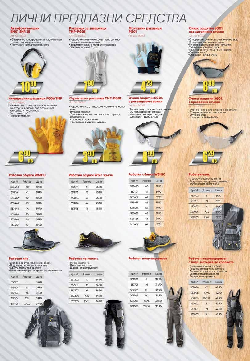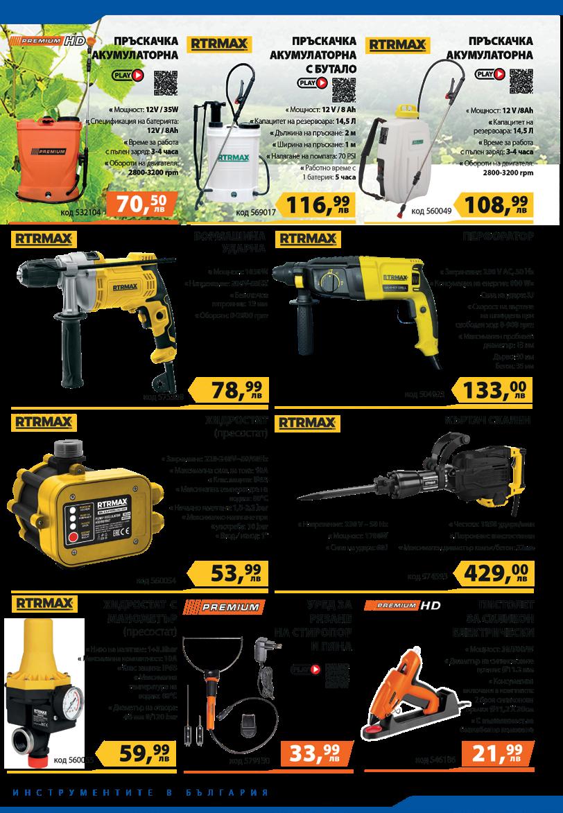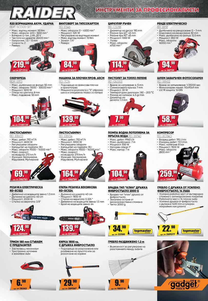 ПИСТОЛЕТ ЗА ГОРЕЩ ВЪЗДУХ RRHQ HG-100 • Мощност: 2000 W • Кабел: 2 м • 3 степени: - I степен: 50°C, 250 л./мин. - II степен: 50-400°C, 250 л./мин. - III степен: 50-600°C, 500 л./мин. 4711лв. 536236 САБЛЕН ТРИОН 900W RRHQ RS-100 • Захранване :220V 50 Hz • Мощност :900 W • Обороти на празен ход: 0-2800 RPM • Ход на ножа: 20 mm • Капацитет на рязане • Дърво :115 mm • Метал: 3 mm • Клас на защита II” лв. 580464 7399 ПЕРФОРАТОР RRHQ RH-200 • Мощност: 1100 W • Обороти на празен ход: 0-1000 об./ мин. • Честота на удара: 0-5100 удара / мин. • Сила на удара: 5 J • Дължина на кабела: 2 м лв. 536231 14399 ЕЛЕКТРИЧЕСКИ ВИНТОВЕРТ RR HD-10 • Мощност: 280 W • Обороти: 0-750 об/мин. • Въртящ момент: 16.5 Nm • Реверс лв. 534050 3999 ЦИРКУЛЯР RRHQ CS-100 • Мощност: 1500 W • Об. на празен ход: 4500 об./мин. • Диаметър на диска: 185 мм 12499 лв. 536235 ЪГЛОШЛАЙФ RRHQ AG-201 • Мощност: 750 W • Захранване: 230V / 50Hz • Обороти: 10000 мин. -1 • Диаметър на диска: 125 мм. 6455лв. 549702 АКУМУЛАТОРНА БОРМАШИНА RR LCD PROMO-11 6799 лв. 557219 • Захранващо напрежение: 16 V • Литиево-йонна батерия: 1.5 Ah • Степени на въртящия момент: 18+1 • Максимален въртящ момент: 25 Nm 999 лв. 16” 26933 КУФАР ЗА ИНСТРУМЕНТИ 499лв. 1399лв. 19’’ 19229 13’’ 19228 2399 лв. КОМПЛЕКТ КЛЮЧОВЕ ЗВЕЗДОГАЕЧНИ МАТИРАНИ/6-22 513909 УДАРЕН ЕЛЕКТРОНЕН ГАЙКОВЕРТ 1 / 2 “ 1100W RRHQ EIW - 100 • Захранване: 230V 50 Hz • Мощност: 1100 W • Oбороти на празен ход: 2200 мин-1 • Макс. сила на въртящ момент: 450 Nm • Присъединителен размер: 1/2” лв. 579356 13099