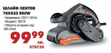 • Мощност: 1400W • Блокировка на вала • Максимални обороти: 1000-3300 об./мин. • Диаметър на диска: 180 мм • Напрежение: 220V/50Hz 547663 11599 лв. ПОЛИРМАШИНА 11599 лв. 578735 ЪГЛОШЛАЙФ • Мощност: 1050 W • Диаметър на шлифовъчния диск: 125 мм • Странична ръкохватка 547660 9599 лв. • Мощност: 1600W • Обороти: - I степен:180 - 460 об./мин. - II степен: 300 - 750 об./мин • Диаметър на бъркалката: 140 мм • Обем на разтвора:120/140 л. СТРОИТЕЛЕН МИКСЕР DAEM 1600 лв. 16599 550481 БОРМАШИНА АКУМУЛАТОРНА ДВУСКОРОСТНА 18 V • Мощност - 18 V • Батерия - 2000 mAh Li-ion • Обороти - 0-400 /0-1500 об./мин. 12399 лв. 550006 ПЕРФОРАТОР DARH-26SRE 800W • Мощност: 800W • Напрежение: 240V • Честота: 50-60Hz • Обороти на празен ход: 0 – 1100 об./мин. • Честота на удара: 0 – 4900 уд/мин. • Енергия на удара: 3 J 11999лв. 590997 77778 1/2” 255 мм 80243 24.99 лв. 92555 1/4” 16.99 лв. ТРЕСЧОТКА ГЕДОРЕ 1/4” / 1/2” (4 - 32 ММ) 108 ЧАСТИ 19900 лв. 77451 699 лв. 513439 ЩАНГА 600 мм