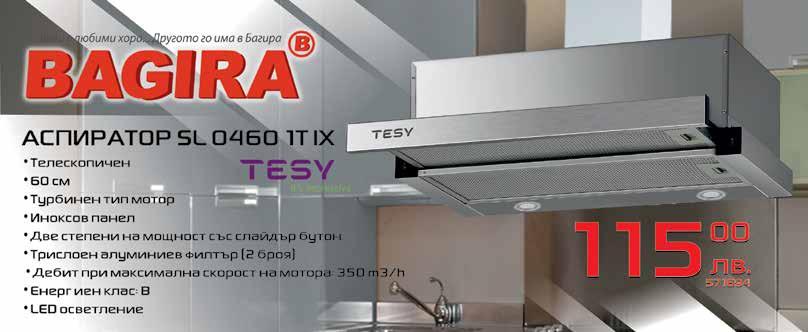 573797 CN03 200 MIS F 185.00лв. 571685 CN03 250 MIS F 199.00лв. ПАНЕЛНИ КОНВЕКТОРИ • Mощност 2500 W • Възможност за използване в баня - защита от водни пръски IP24 • Оптимална конвекция • Регулируем термостат • Защита против замръзване • Защита от преобръщане • Защита от прегряване • Обем: 80 литра Мощност: 3 kW • Налягане: 0,8 MPa • Размери: 120 х 38 х 41 см • Клас на ен. ефективност: С • Термометър • Регулир. термостат ● Вертикален монтаж ● С механично управление ● Стъклокерамично покритие ● 3 години гаранция БОЙЛЕР CTV 803830 B12 TSR 25900 лв. 580270 • Аспиратор каминен • 60 см • Инокс коминно тяло • Петслоен алуминиев филтър- 2 броя • Максимална мощност на изсмукване 350 куб. м/ч • LED осветление • Клас на енергийна ефективност: А АСПИРАТОР TESY CH 1760 1T IX 60 13500лв. 587993 5499 лв. 582614 3,3KW T6 582613 3,3KW T5 ВОДОНАГРЕВАТЕЛНА БАТЕРИЯСВЕТОДИОД • Мощност: 3.5 kW • Напрежение: 230 V - 50 Hz • Работно налягане: 0.2 - 0.8 MPa • Влагозащита: IP X1 • Водосъдържател ултрамит ПРОТОЧЕН ВОДОНАГРЕВАТЕЛ С МЕТАЛНА СМЕСИТЕЛНА БАТЕРИЯ 9900 лв. 12199 586798 ЧЕРЕН 18 м 586797 СИВ 18 м 2129лв. СУШИЛНИК ЗА ДРЕХИ BRIO GOLD • Обем: 82 литра • Мощност: 3 kW • Налягане: 0,8 MPa • Размери: 84.50 х 44 см • Клас на ен. ефективност: С • Термометър • Регулир. термостат ● Вертикален монтаж ● С механично управление ● Стъклокерамично покритие ● 3 години гаранция БОЙЛЕР TESY CTV 804430 B12 TSR 25900 лв. 580269