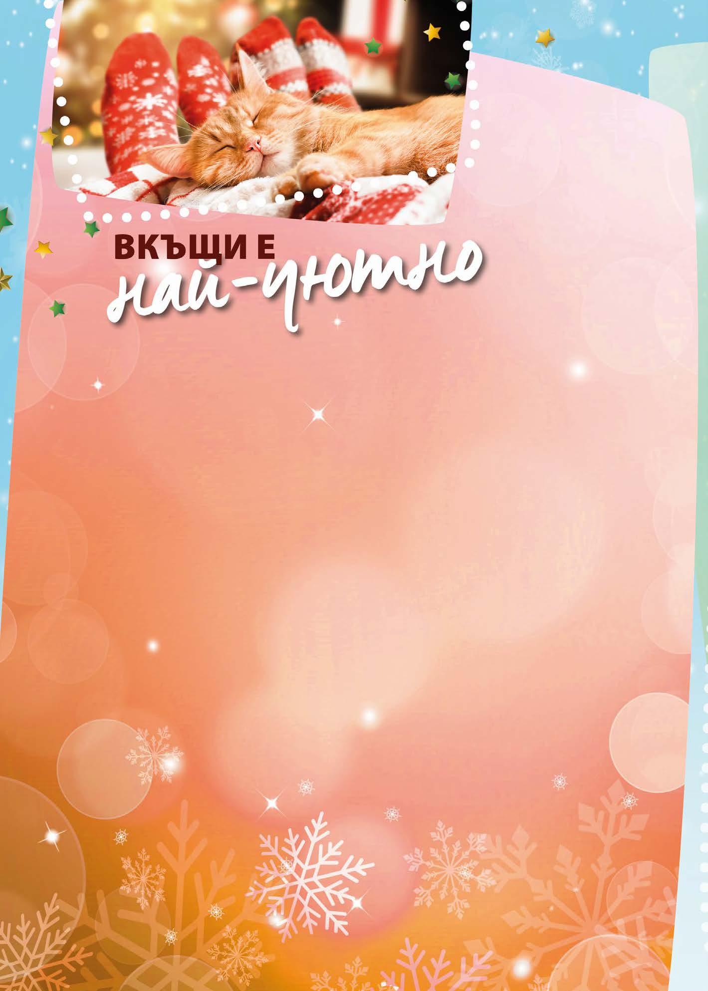 СЕГА В BILLA лв. 299 Писмо до Дядо Коледа 1 бр. СЕГА В BILLA лв. 999 Коледна шапка за деца 1 бр. лв. 899 -30% Шоколадово яйце Kinder maxi 100 г предишна цена 12,99 лв.1499 -21% Коледен комплект Milka + подарък Коледни чорапки 652,75 г предишна цена 18,99 лв. 189 -24% Дядо Коледа Milka 45 г предишна цена 2,49 СЕГА В BILLA лв.1799 Коледна плюшена играчка 28 см 1 бр. СЕГА В BILLA лв.2699 Елза и ледената конюшня на Нок LEGO Disney 1 бр. лв. 649 -23% Коледна чантичка или Автобус на Дядо Коледа Roshen 294 – 298 г предишна цена 8,49 Промоционалните стоки се продават в количества, предназначени за домакинството. Всички оферти са валидни до изчерпване на количествата. BILLA не носи отговорност за допуснати печатни грешки. BILLA си запазва правото да променя цените. Повече на www.billa.bg С този знак се означават продукти, които могат да бъдат закупени еднократно на цена с отстъпка при едновременно маркиране на дигитален ваучер и BILLA Card в приложението BILLA App. Ваучерите са достъпни и на www.billa.bg. Ограничения в закупуваните количества и срок на валидност на офертата се посочват върху ваучера. Отстъпката получаваш веднага на каса. Повече в BILLA App и на www.billa.bg Продуктите, означени в брошурата със символа синя звезда не са налични в магазини BILLA: гр. София, бул. „Цариградско шосе“ №12, ул. „Обиколна“ №32, бул. „Цар Освободител“ №22, ул. „Раковски“ №116, пл. „Лъвов мост“ № 2, ул. „Пиротска“ №9, бул. „Княз Александър Дондуков Корсаков“ №11, ул. „Висарион Белински“ №2Б, ул. „Славянска“ №5, ул. „Пимен Зографски“ №38, ул. „Райко Алексиев“ №40, бул. „Ал.Стамболийски“ №247-В; гр. Пловдив, ул. „Райко Даскалов“ № 8, ул. „Черешово топче“ №2; гр. Бургас, ул. „Александровска“ № 58, ж.к. Изгрев, бл. 178, ул. „Слънце“ №30; гр. Варна, ул. „Димитър Икономов“ №36, ул. „Дубровник“ №46, бул. „Княз Борис I“ №99; гр. Русе, ул. „Неофит Бозвели“ №18, пл. „Свобода“ №7; гр. Стара Загора, ул. „Княз Борис“ №93, бул. „Цар Симеон Велики“ №105 А; гр. Хасково, пл. „Общински“ №3; гр. Шумен, бул. „Славянски“ №30; гр. Плевен, пл. „Свобода“ №25; гр. Благоевград, ул. „Крали Марко“ №1; гр. Кюстендил, ул. „Пауталия“ №10; гр. Велико Търново, ул. „Георги Измирлиев“ №13А; гр. Монтана, ул. „Акад. Иван Дуриданов“ №2. НАЦИОНАЛЕН ТЕЛЕФОН НА КЛИЕНТА 0700 120 10 СВЪРЖИ СЕ С НАС НА ЦЕНАТА НА ЕДИН ГРАДСКИ РАЗГОВОР