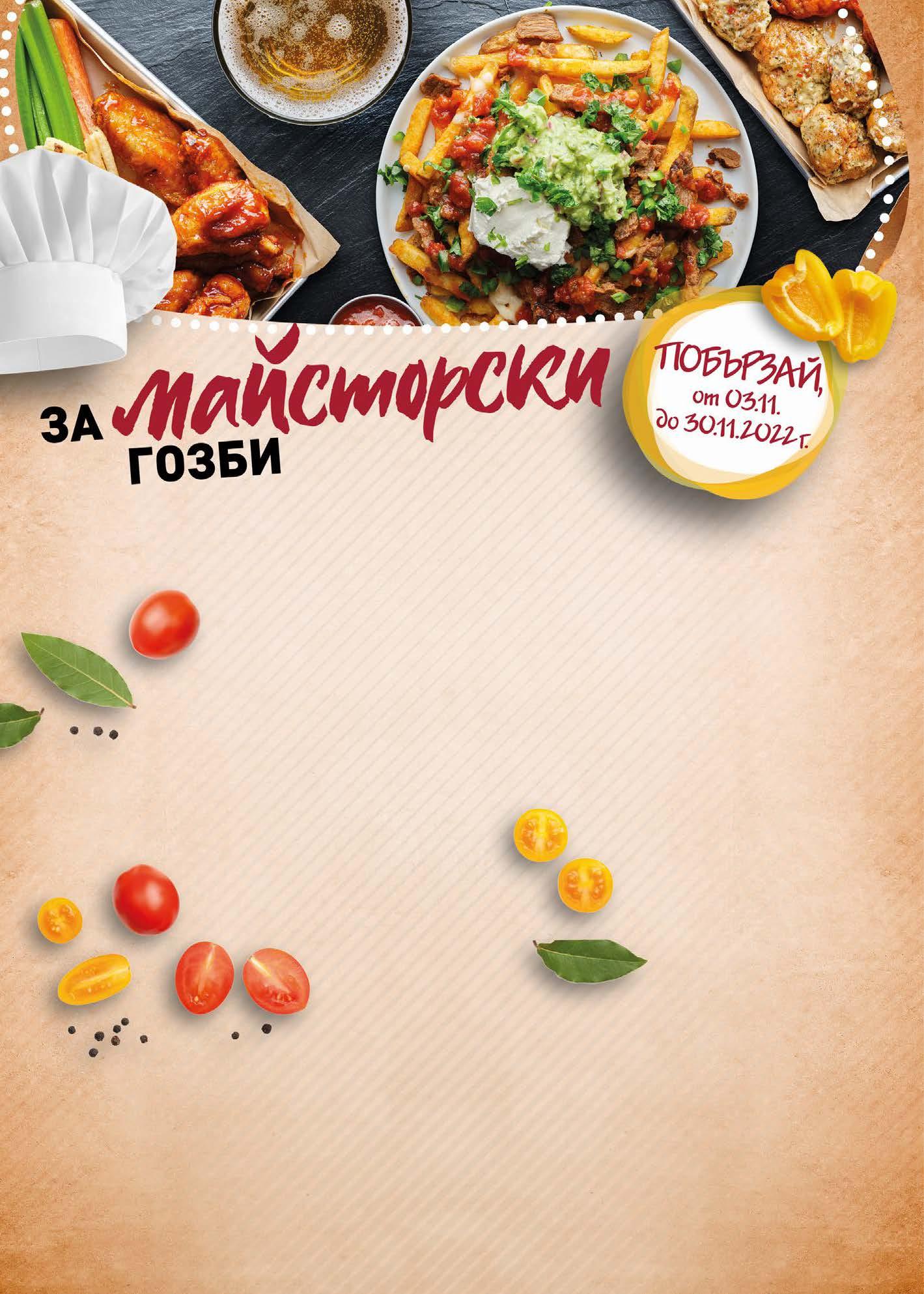 лв. 699 -30% Свински бут без кост За 1 кг предишна цена 9,99 лв. 899 -33% Свински врат без кост За 1 кг предишна цена 13,49 лв.1099 -15% Мариновани свински ребра Spare За 1 кг предишна цена 12,99 лв. 449 -18% Телешки кюфтета, кебапчета 400 г предишна цена 5,49 ВСЕКИ ДЕН прясно МЕСО ЗА ВСЕКИ ВКУС лв.1049 -18% Свински шницел Българска ферма За 1 кг предишна цена 12,89