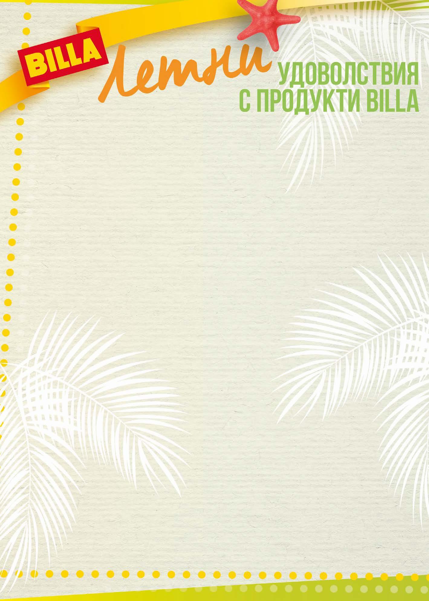ПН 29.08. 30.08. ВТ 31.08. СРСупер СТАРТ * До 12 броя на клиент от артикула, попадащ в акционната активност. лв.499 -28% Карначе 600 г предишна цена 6,99 лв.1399 -21% Кашкавал от кравеДряновомляко 1 кг предишна цена 17,90 лв.3099 -22% Тенесиуиски Jack Daniel‘s** 0,7 л предишна цена 39,99 лв.749 -21% RaffaelloБонбони 230 г предишнацена9,59 лв.129 -43%свинскоотНаденицакълцаномесо От топлата витрина1бр. предишна цена 2,29 лв.039 -50% Диня BILLA Градини 1 кг предишна цена 0,79 Градините в с. Къпиново лв.395 слънчогледовоРафинираноолиоБулгарче* 1 л цена без BILLA Card5,39До 12 бр. на клиент До 5 бр. на клиент**До5 броя на клиент от артикула, попадащ в акционната активност. Промоционалните стоки се продават в количества, предназначени за домакинството. Всички оферти са валидни до изчерпване на количествата. BILLA не носи отговорност за допуснати печатни грешки. BILLA си запазва право то да променя цените. Повече на www.billa.bg С този знак се означават продукти, които могат да бъдат закупени еднократно на цена с отстъпка при едновременно маркиране на дигитален ваучер и BILLA Card в приложението BILLA App. Ваучерите са достъпни и на www.billa.bg. Ограничения в закупуваните количества и срок на валидност на офертата се посочват върху ваучера. Отстъпката получаваш веднага на каса. Повече в BILLA App и на www.billa.bg Продуктите, означени в брошурата със символа синя звезда не са налични в магазини BILLA: гр. София, бул. „Цариградско шосе“ №12, ул. „Обиколна“ №32, бул. „Цар Освободител“ №22, ул. „Раковски“ №116, пл. „Лъвов мост“ № 2, ул. „Пиротска“ №9, бул. „Княз Александър Дондуков Корсаков“ №11, ул. „Висарион Белински“ №2Б, ул. „Райко Алексиев“ №40; гр. Пловдив, ул. „Райко Даскалов“ № 8, ул. „Черешово топче“ №2; гр. Бургас, ул. „Александровска“ № 58, ж.к. Изгрев, бл. 178, ул. „Слънце“ №30; гр. Варна, ул. „Димитър Икономов“ №36, ул. „Дубровник“ №46; гр. Русе, ул. „Неофит Бозвели“ №18, пл. „Свобода“ №7; гр. Стара Загора, ул. „Княз Борис“ №93, бул. „Цар Симеон Велики“ №105 А; гр. Хасково, пл. „Общински“ №3; гр. Шумен, бул. „Славянски“ №30; гр. Плевен, пл. „Свобода“ №25; гр. Благоевград, ул. „Крали Марко“ №1; гр. Кюстендил, ул. „Пауталия“ №10; гр. Велико Търново, ул. „Георги Измирлиев“ 13А; гр. Кърджали, ул. „Баба Тонка" №24. Брошурата е валидна за всички магазини BILLA с изключение на магазини BILLA: гр.София, бул. „Ал. Малинов“ №89 НАЦИОНАЛЕН ТЕЛЕФОН НА КЛИЕНТА 0700 120 10 СВЪРЖИ СЕ С НАС НА ЦЕНАТА НА ЕДИН ГРАДСКИ РАЗГОВОР